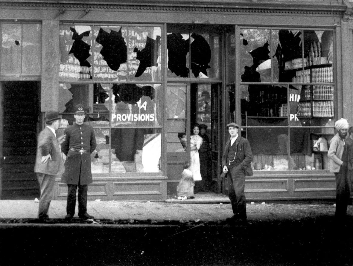 1907年9月初,加拿大新成立的反亚裔联盟(Asiatic Exclusion League)在温哥华市府前组织了一次大规模的反亚裔集会,当年温哥华人口仅有10万,几乎三分之一都参加了这次集会和骚乱。