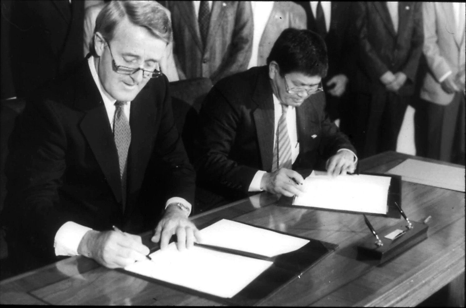 (↑ 加拿大总理Brian Mulroney马尔罗尼在日裔加拿大人协会主席见证下向全体日裔加拿大人致歉1988年9月22日)