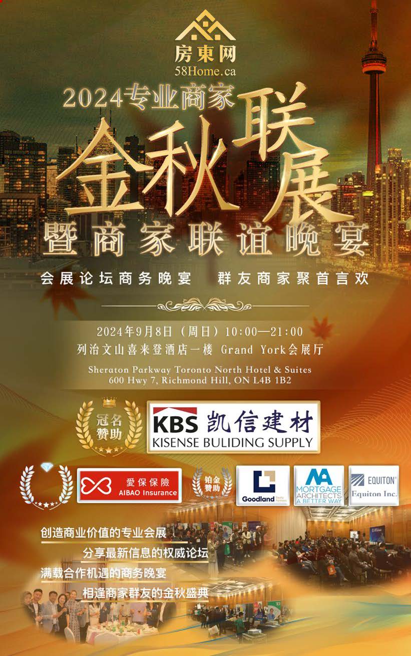 枫叶转红,秋意渐浓的九月,加国最大华裔地产投资人社区——房东网,将于9月8日(本周日)在列治文山喜来登酒店一楼会展大厅盛大举办“2024金秋联展暨商务联谊晚宴”。届时,大多伦多、温哥华、伦敦等地的地产、贷款、会计税务、保险理财、旅游、餐饮及商业等近百专业商家齐集一堂,众多地产投资人和群友热闹相聚,我们邀您一起逛展会、淘特惠,赢大奖!
