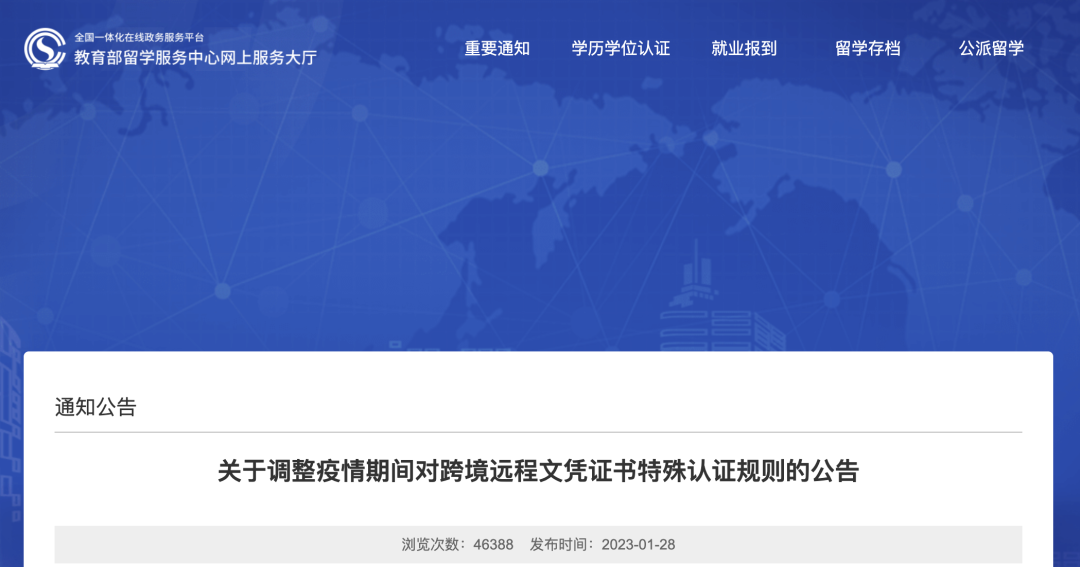 1月28日,中国教育部留学服务中心官方网站发布公告,调整疫情期间对跨境远程文凭证书特殊认证规则。