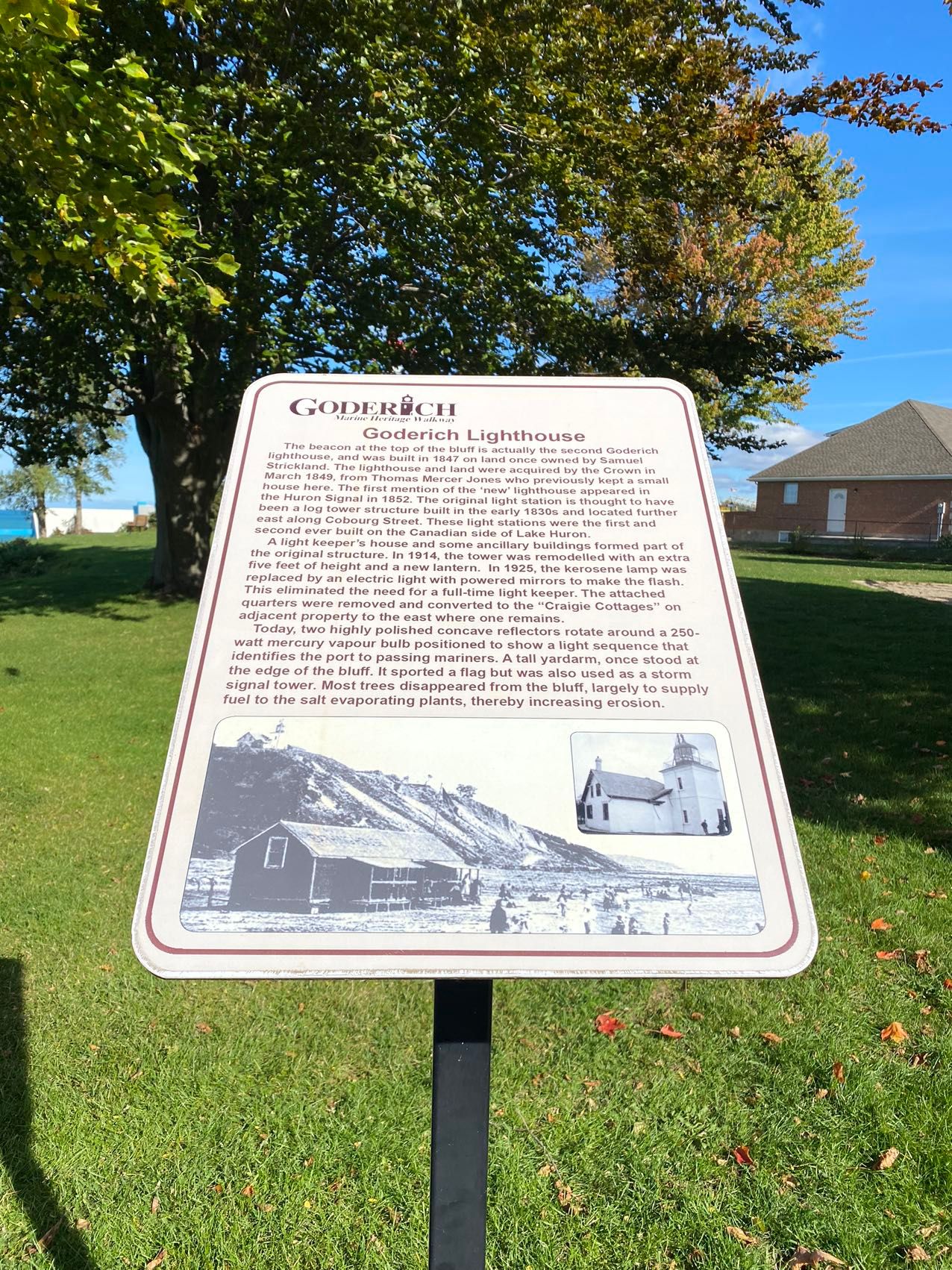 戈德里奇灯塔是休伦湖上最古老的加拿大灯塔,最初由一对建于 1830年代初期的射灯组成,1847年建成了灯塔。1913 年11月,两大风暴锋面在五大湖汇合,造成该地区最致命、最具破坏性的自然灾害。飓风在休伦湖掀起 35英尺高的海浪,夺走了 8艘货轮及其近 200名船员的生命,灯塔被技术革新了一番。2003 年8月29日,伊丽莎白二世女王陛下以 1元的价格将灯塔和周围的土地卖给了戈德里奇镇政府。2009 年,当地的海洋爱好者和海洋遗产委员会,希望将灯塔的外观恢复到原来的状态。经过广泛的研究,这座塔被剥去油漆,用旧灰浆重新粉刷,并于于 2010年6月举行了盛大的公众开放仪式。