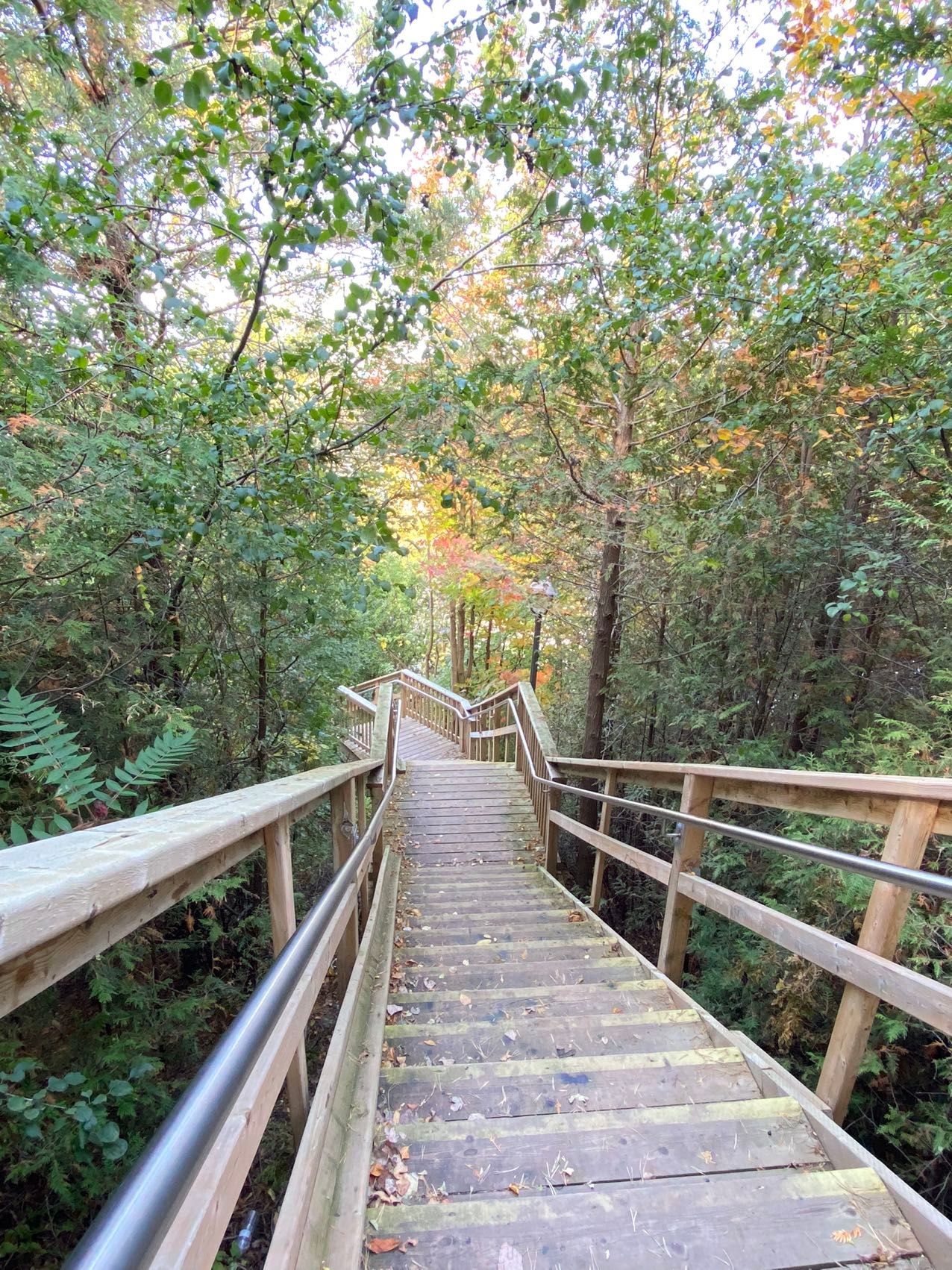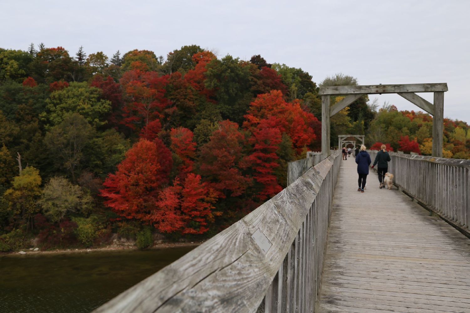 戈德里奇还有一处铁路桥MENESETUNG桥,这座桥跟当年的太平洋铁路有关。爱丽丝门罗曾有一篇文章,题目就叫MENESETUNG。1907年,连接Goderich和Guelph两地的Menesetung铁路桥建成,是安省当时最长的铁路桥梁,但1989年被遗弃,1992年转为步行道。这里是赏枫的最佳地点,跟阿岗昆公园乌泱乌泱的赏枫人群相比,这里秀美壮丽而安静。
