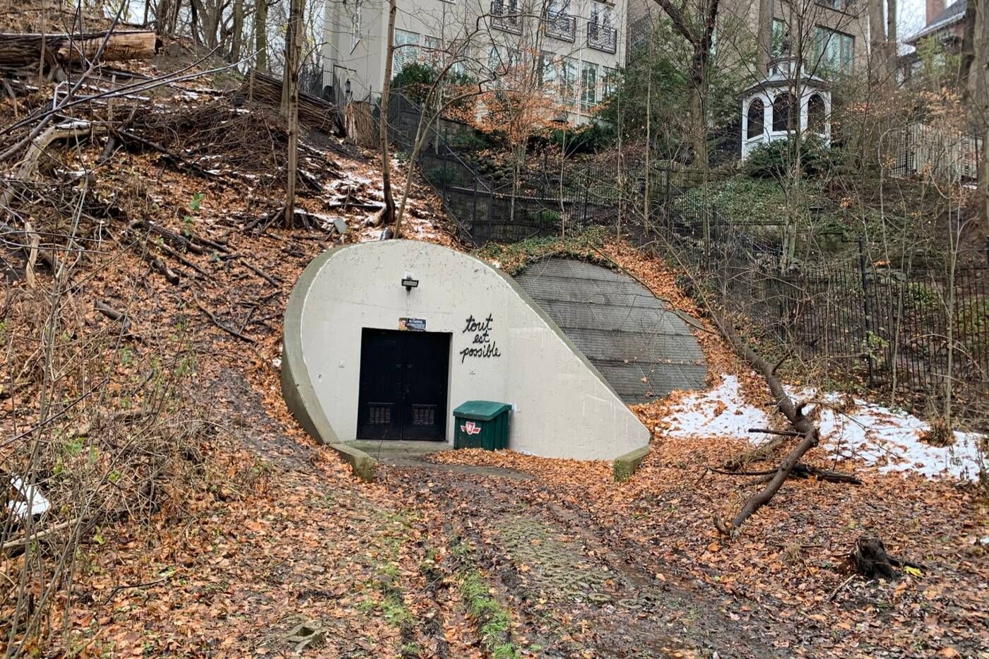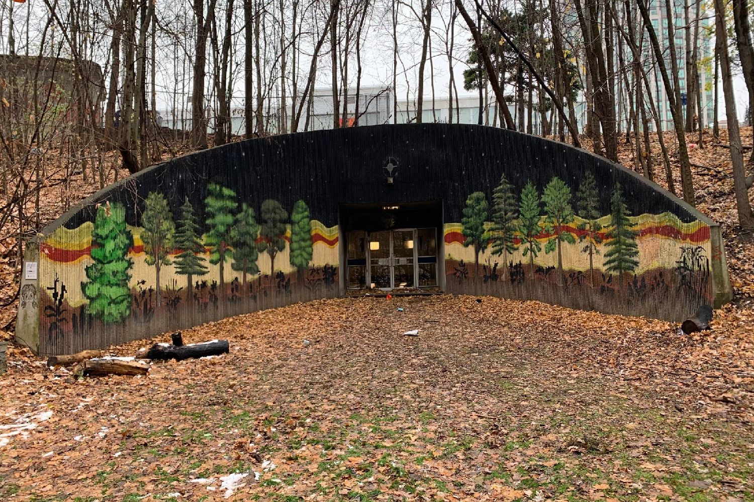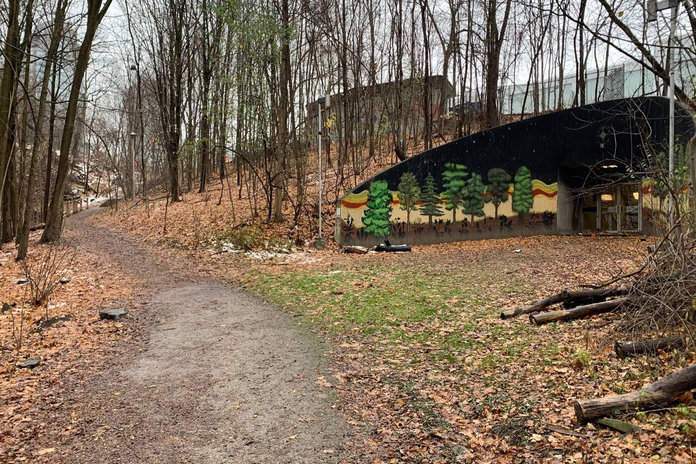 您不必深入树林就能看到位于小径起点的彩绘地铁出口。靠近入口处,有一个通往地铁的紧急出口,与周围峡谷的自然环境形成鲜明对比。