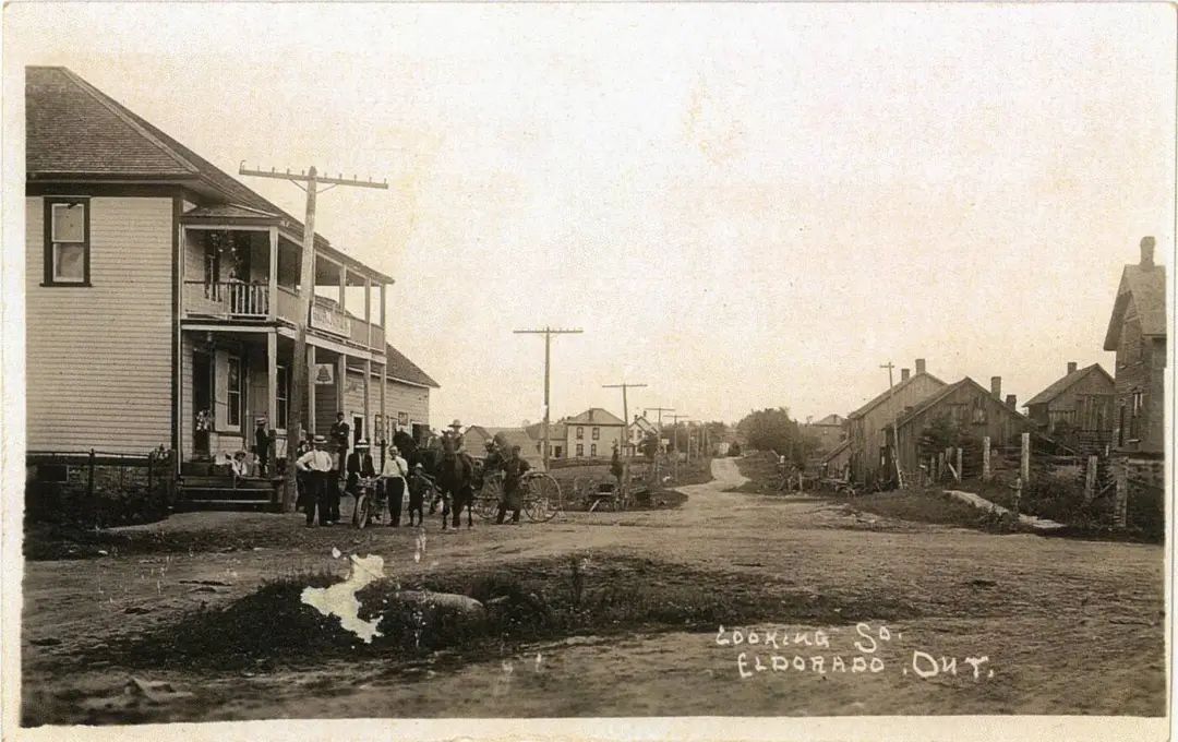 【威廉·弗里曼(William Freeman,1886-1979年)在安大略省林德赫斯特的大干线铁路担任站长,拍摄的这张照片显示,一群男人和男孩聚集在安大略省El Dorado的一座框架建筑(可能是一家酒店)外。这座建筑与目前那里的一座相似。】