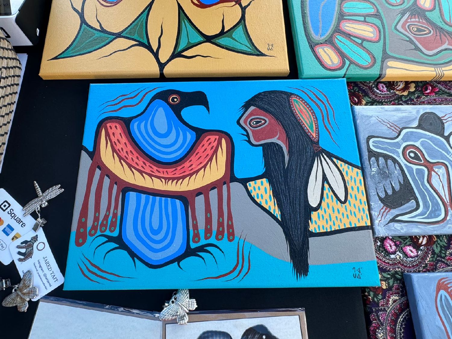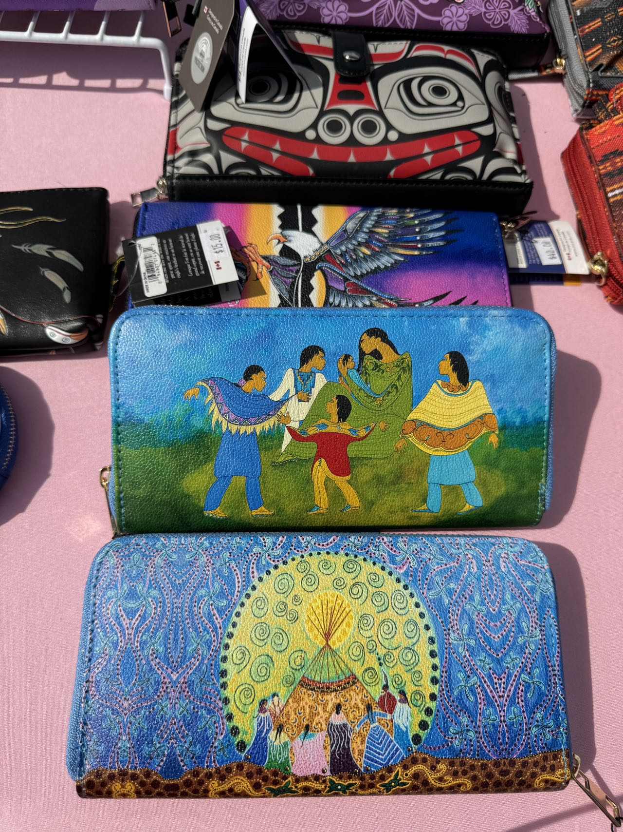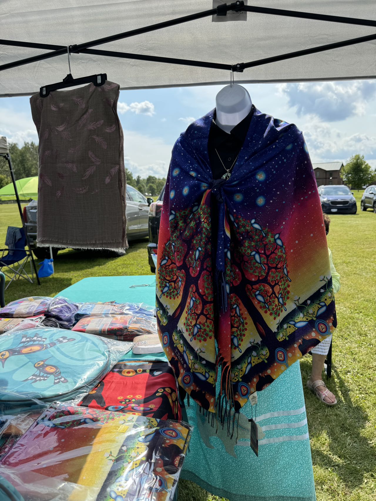 场地四周是琳琅满目的手工艺品,都是原住民手工制作的。也有原住民艺术家设计的各种图案被制成了披肩、围巾、背包、钱夹等。那鲜艳大胆的用色,华丽奔放的图腾表现出厚重旺盛的生命力,真是让人一眼就爱了。