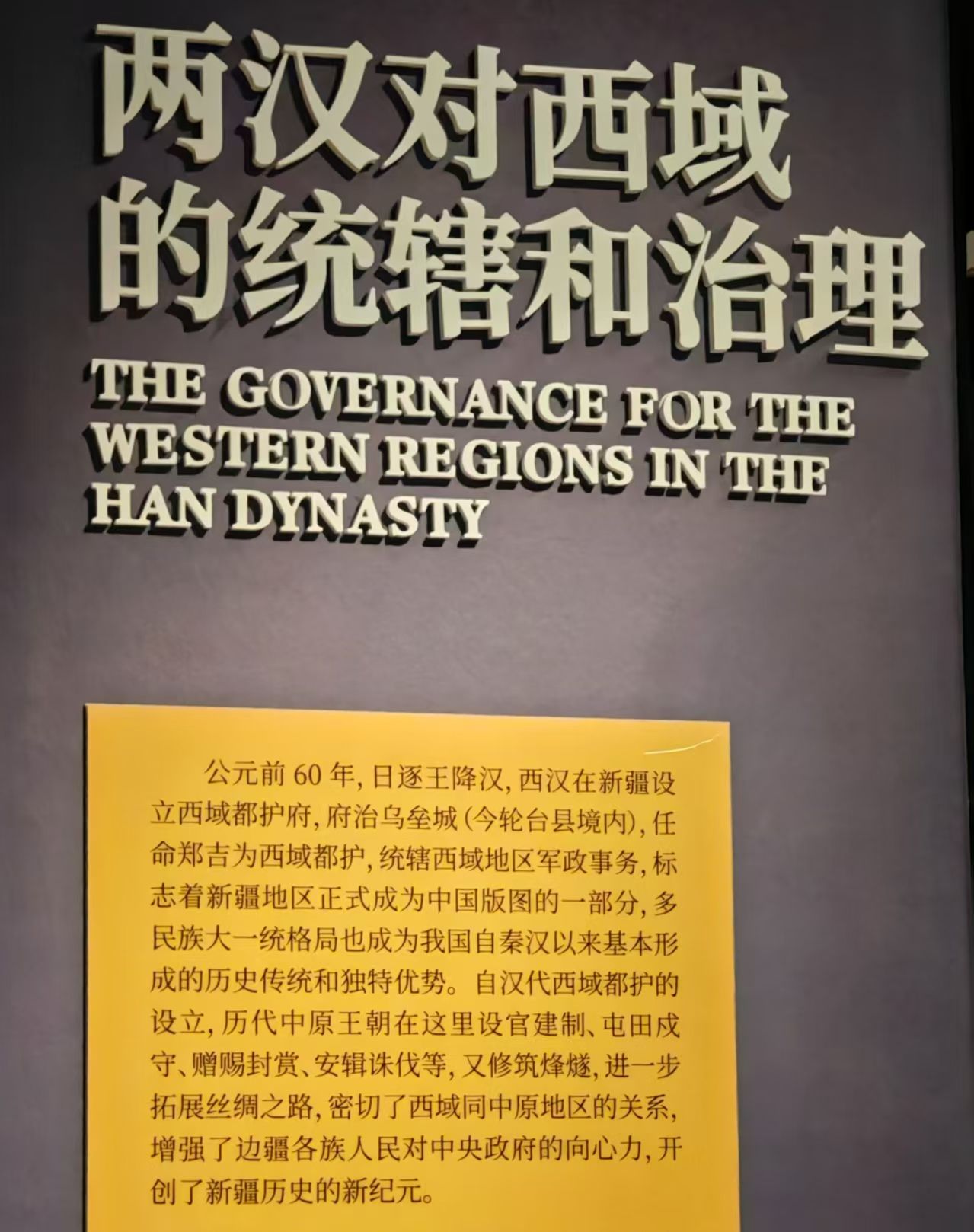 不同的展館,以文物、史述等多種方式,告知當代人民:從幾千年前先秦石器代起,新疆大地同中原文化就扯上了不可分割的緊密關係,早已納入中華文明傳承體系;而且,自公元前的年代起,漢政府就在疆設立有管治機構;從那以後,歷代中原政府都有派駐官員治疆……直至今天。