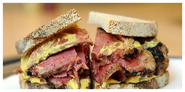蒙特利尔熏肉选用的是牛腩肉,先把牛腩肉清洗干净,再浸泡几天,然后刷上不同的调味香料,再放置几天。最后用烧烤炉进行烟熏,大概要等一整夜时间,可以让味道渗入肉里。熏制好的牛腩肉需要再蒸熟,这样肉才会变嫩。把肉切成薄片,用两片面包夹着吃,对了,涂上芥末酱味道更加地道哦。