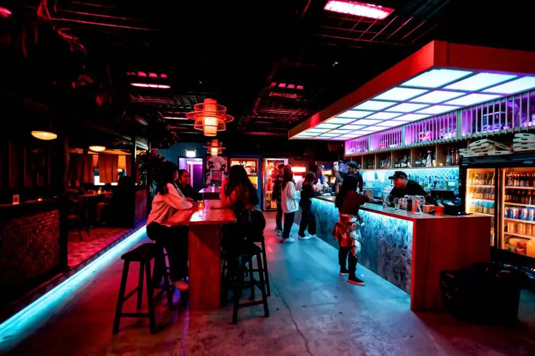二楼有一扇不起眼的门后面是一个大酒吧,看起来就像一个电子游戏。霓虹灯蓝色、紫色和红色灯光欢迎顾客并将他们带入空间。