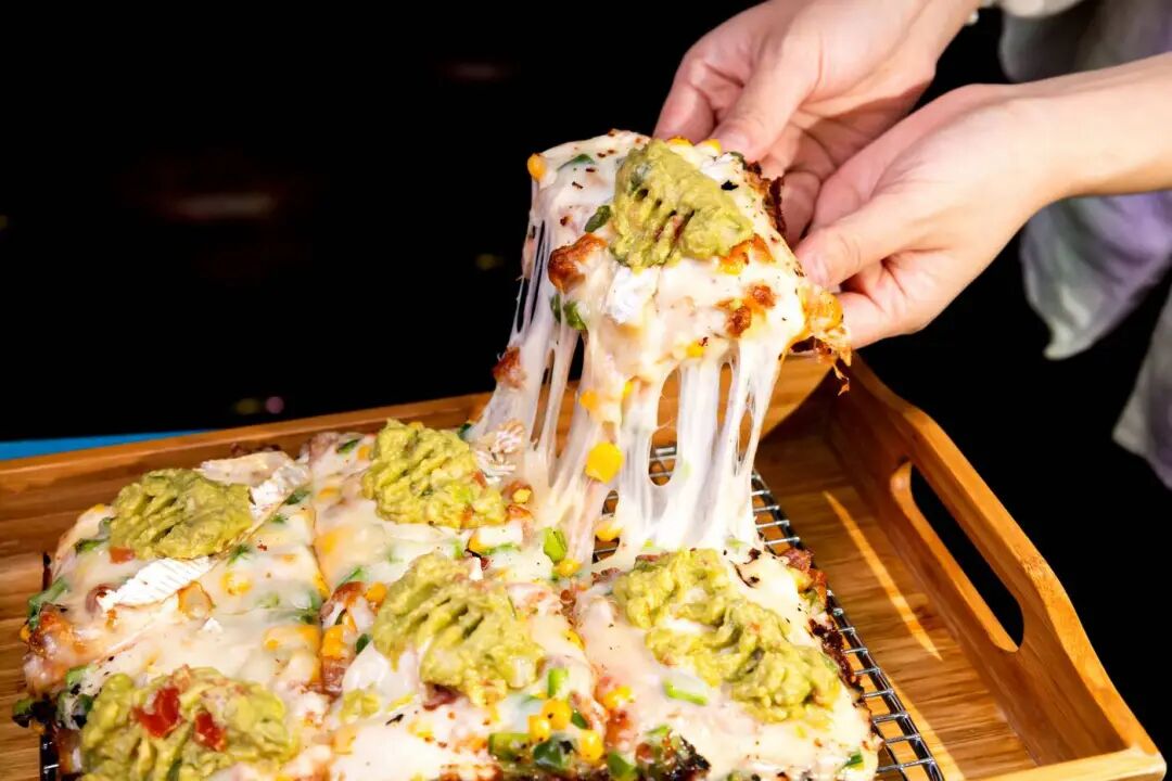 培根披萨(24元)的六片披萨中,每片都有玉米粒、融化的布里干酪、切碎的墨西哥辣椒和鳄梨酱。