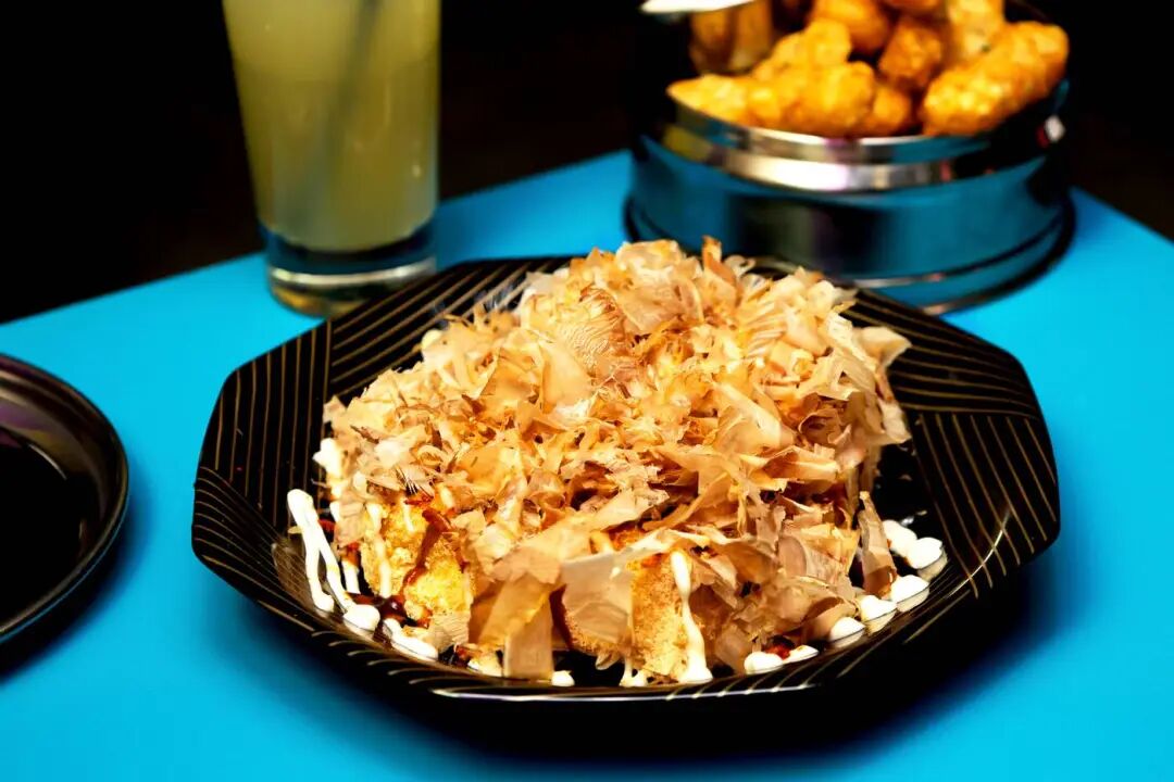 鲣鱼豆腐(9元)是御好烧(日本咸味煎饼)的另一种形式。八块豆腐里塞满虾,上面撒上蛋黄酱、御好烧酱和鲣鱼片。