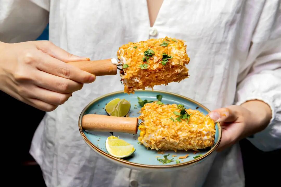 玉米棒子(7元)卷在大蒜奶油中,并覆盖上烤洋葱,然后放在这些方便处理的烤串上,这样您就可以在玩游戏时保持双手清洁。