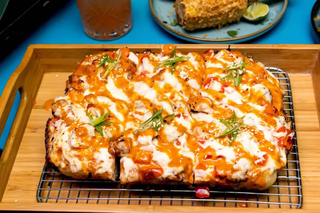 厨房营业至午夜,供应小吃和大小适合分享的厚矩形披萨。整个菜单都具有亚洲风味,范告诉我们,她希望所有的菜品都保持怀旧的风格,以符合酒吧的主题。