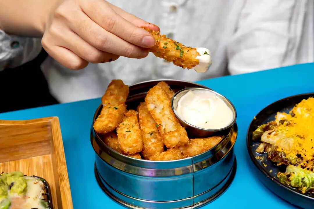 小吃菜单很简单,总共只有六道菜。薯饼(6元)拌有青辣椒盐,呈易于抓握的棒状,可以蘸上柚子蛋黄酱。