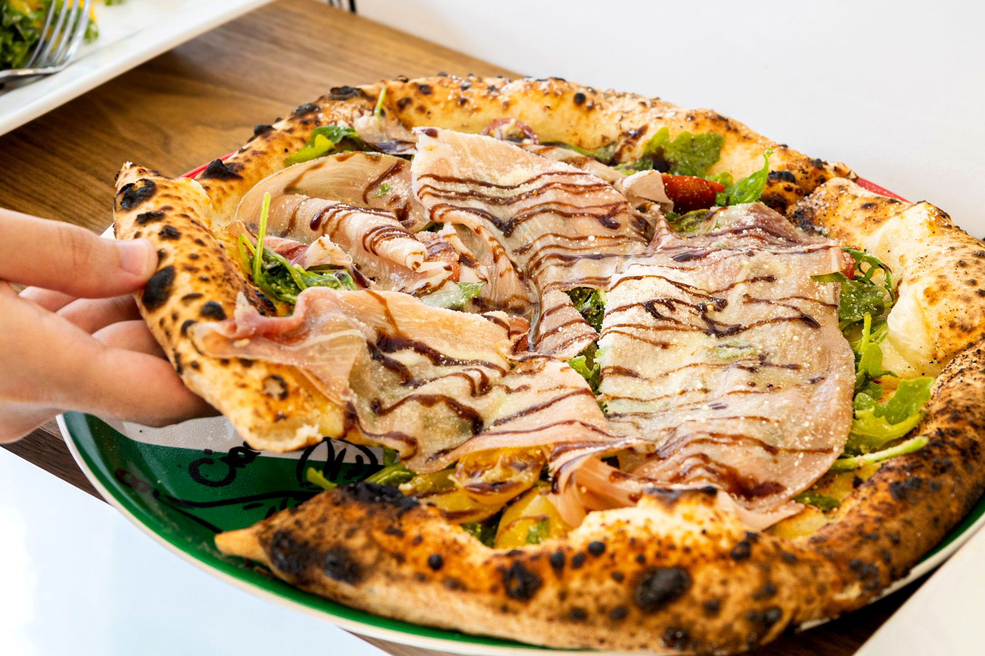 Prosciuttodi Rucola披萨(21元)是一种圆形的那不勒斯风格披萨,上面铺有蒜泥、牛奶巧克力、切片帕达诺奶酪和红酒,还有帕尔马火腿、腌制小番茄和芝麻菜。