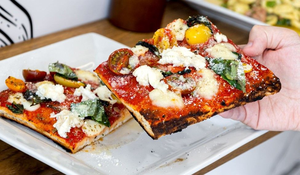 Bastacosi(6元/片)是罗马风格的披萨之一,所有披萨都放在大型矩形烤盘上烘烤。其厚实、松软的饼皮上涂有自制番茄酱、特级初榨橄榄油和菲奥迪拉特马苏里拉奶酪。