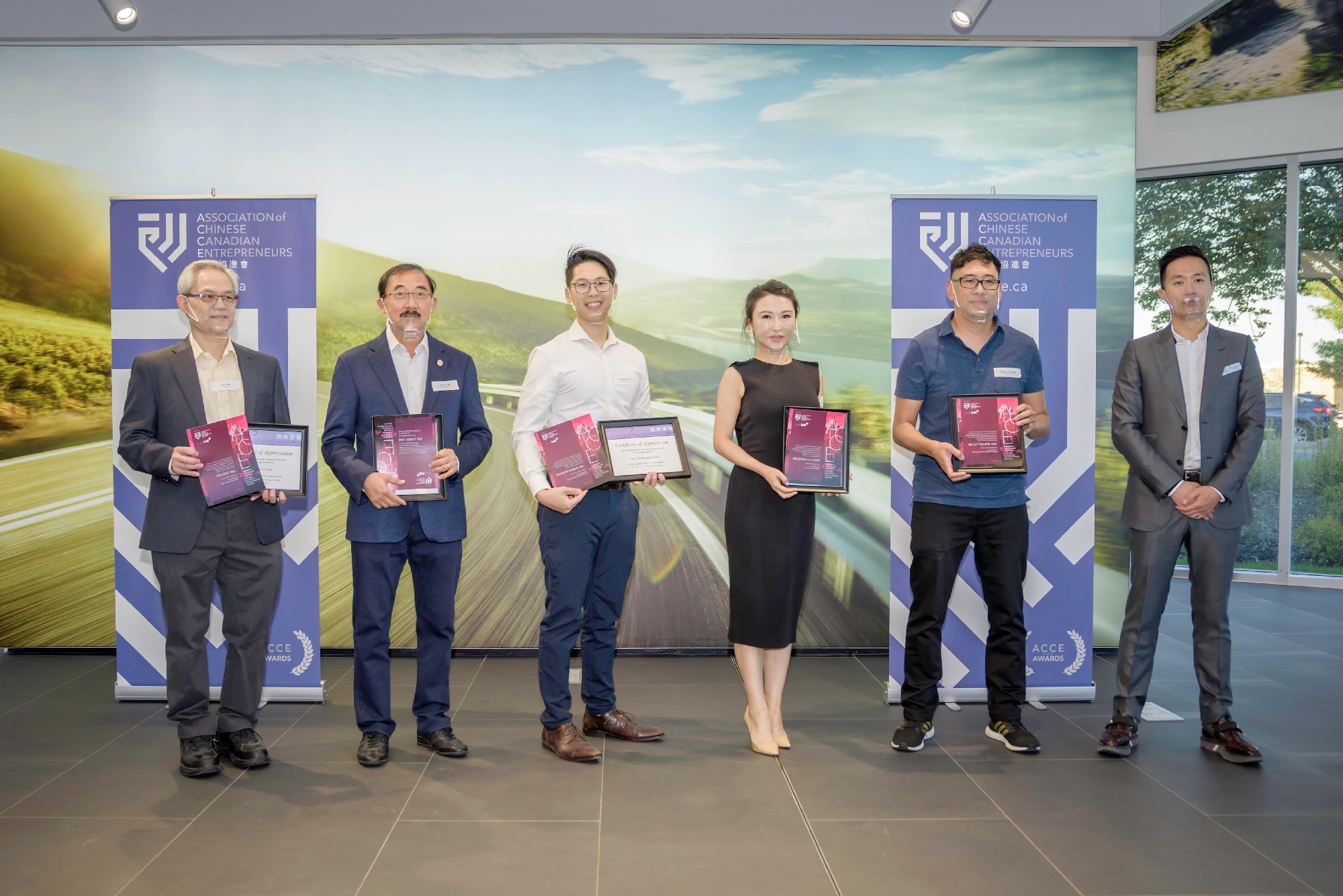 创业协进会(ACCE)主办之「2021年度答谢招待会」。会长欧阳浩东与今年杰出华裔创业家奖得主合影。左起:最佳创意奖得主林升鎏(Vielight Inc.),终身成就奖得主罗国威(Living Water Resorts),杰出青年创业奖得主萧建杲(Daango Sweets Inc.),最佳企业创办奖得主郝思维(Reciprocity Corp.),最佳亚太贸易奖得主肖恩(4D CITYSCAPE INC.)