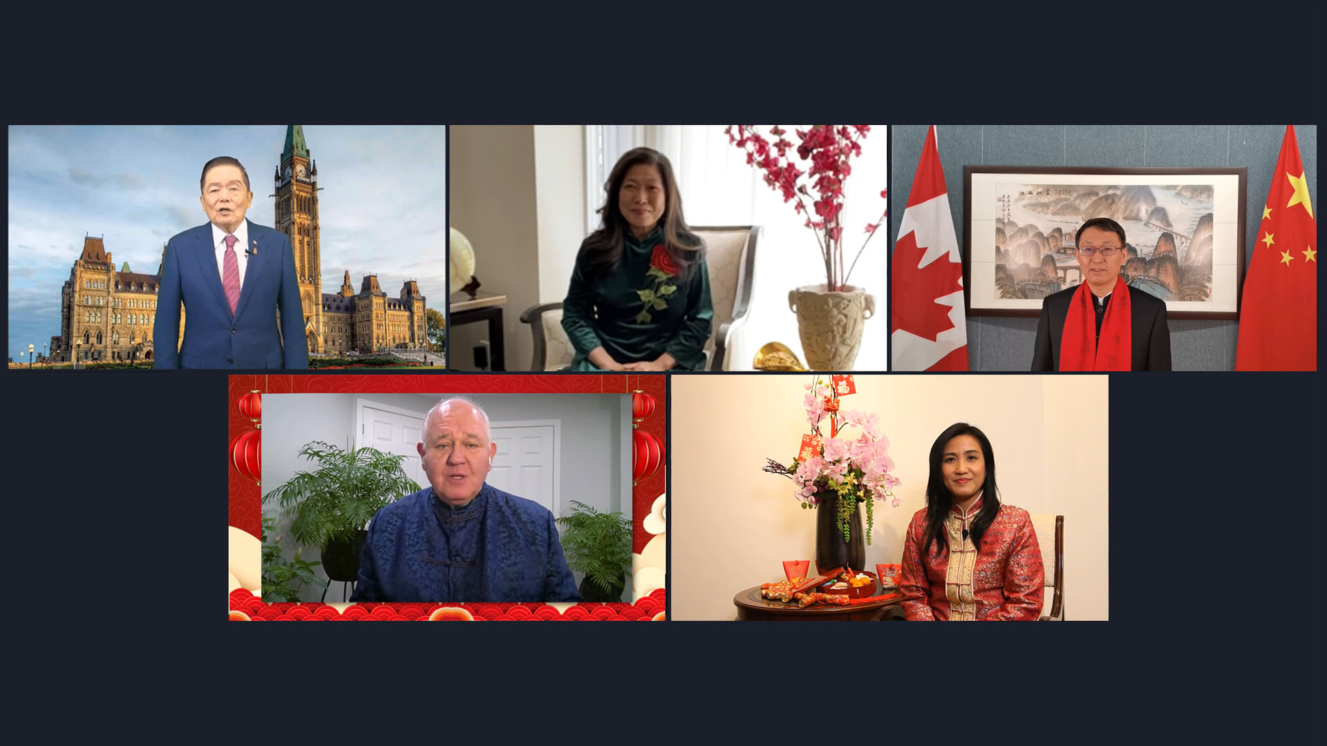 联邦参议员胡子修、联邦小企业丶出口促进及国际贸易部长伍凤仪、中国驻多伦多总领事韩涛丶万锦市市长薛家平及香港驻多伦多经济贸易办事处处长巫菀菁送上祝福视频。