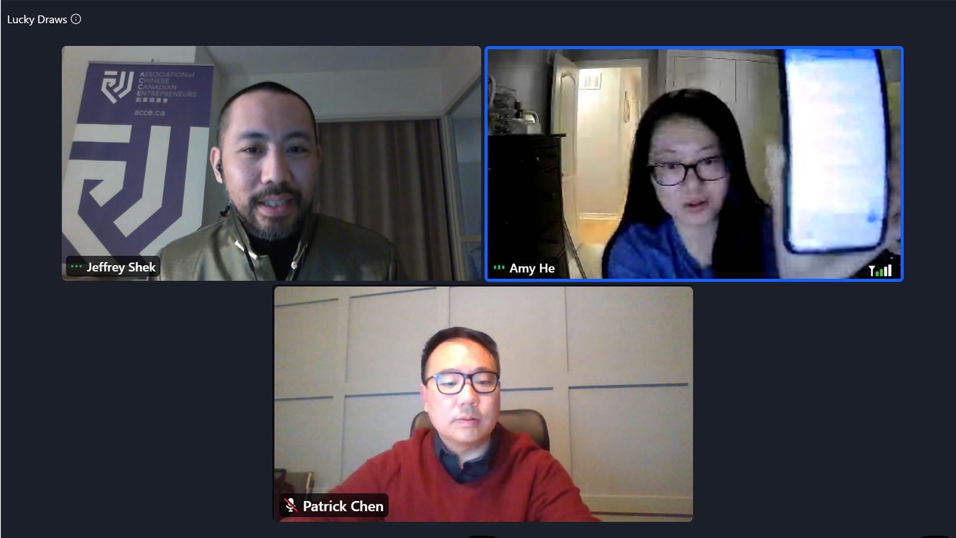(从左至右,上至下):会董石家辉、加拿大第一财富银行代表Amy He和研科(TELUS)代表Patrick Chen主持抽奖环节。