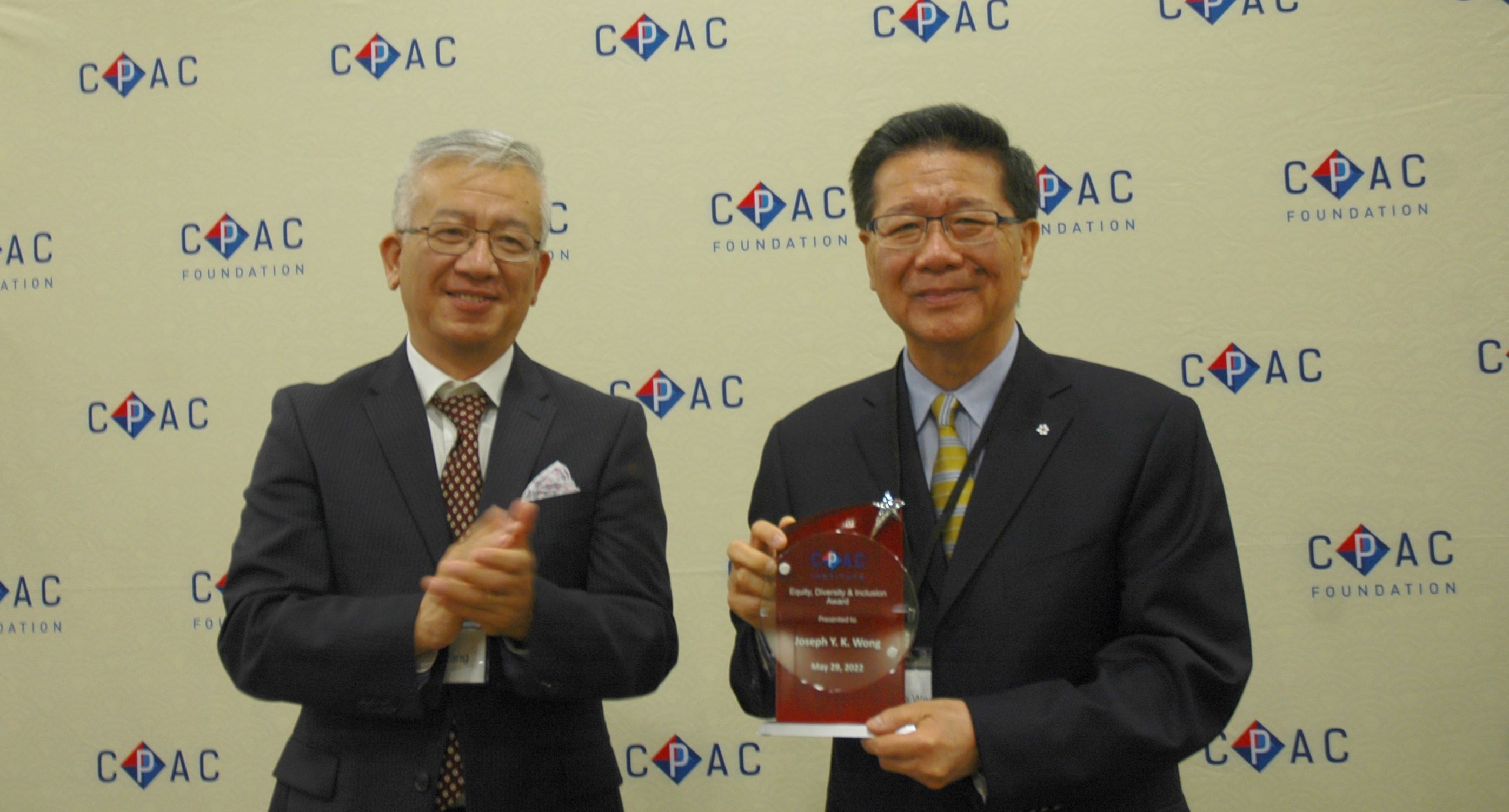 CPAC会长王体博士为王裕佳(Joseph Y.K.Wong)医生(右)颁发首届公平多元共容奖