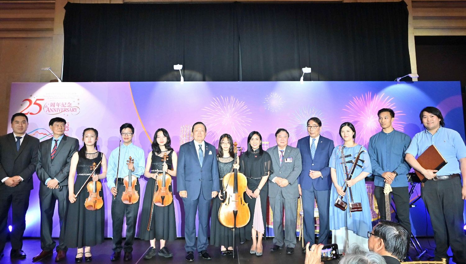 巫菀菁与与加拿大国会议员陈圣源(左1)、安省汇艺音乐协会主席郑干明(左2)、加拿大参议员胡子修(左6)、前缅省省督李绍麟(右5)及安省汇艺音乐协会名誉会长萧显扬(右4)和演奏主题曲《曙光》的一众音乐表演者合照。
