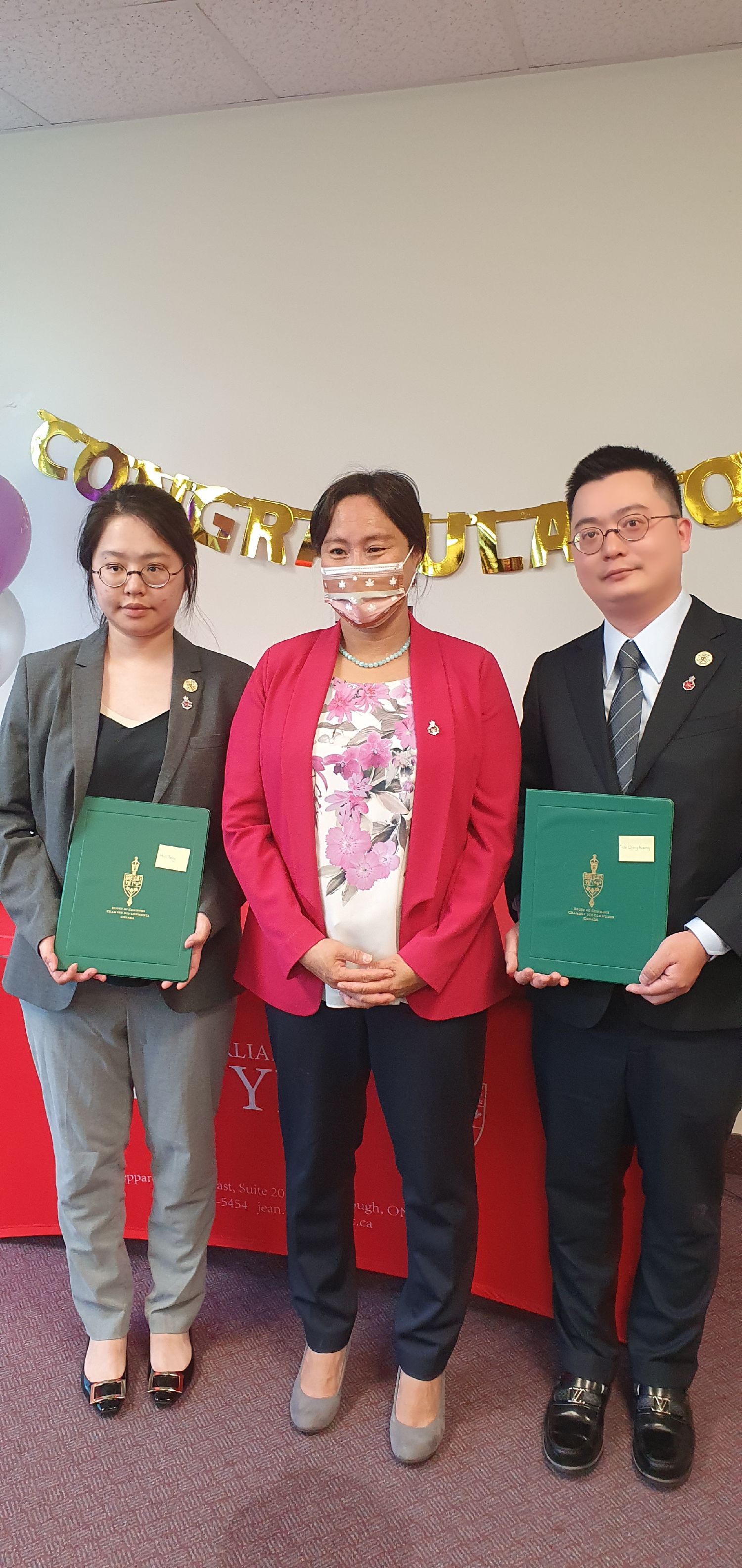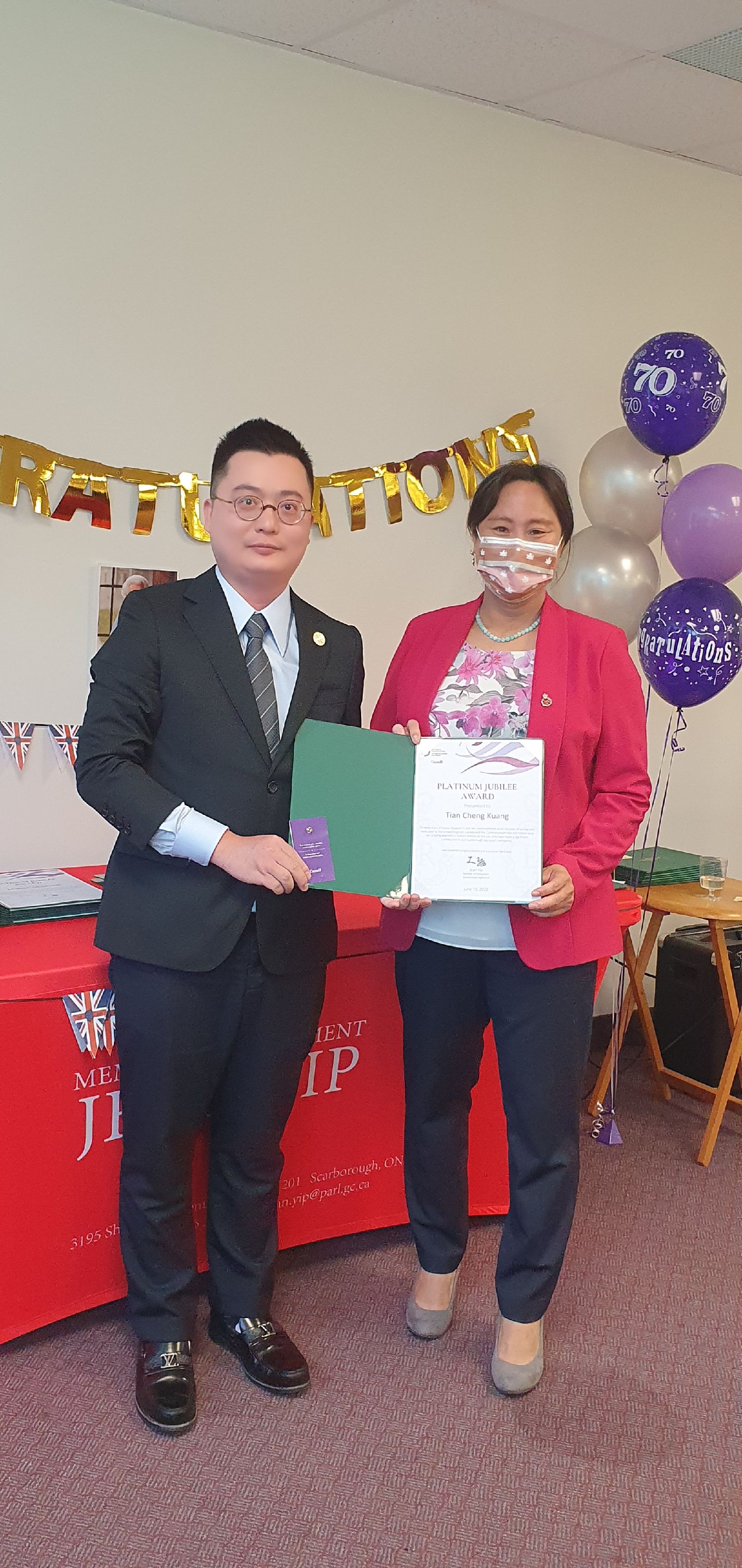 士嘉堡-爱靜阁选区国会议员叶嘉丽(Jean Yip)日前在其办公室代表加拿大总督向加拿大菲科教育集团(Ficus Education Inc)总裁邝天成颁发英女皇伊丽莎白二世登基70周年70周年白金禧年嘉奖并获发徽章,以褒奖他在加拿大社区所作出的贡献。