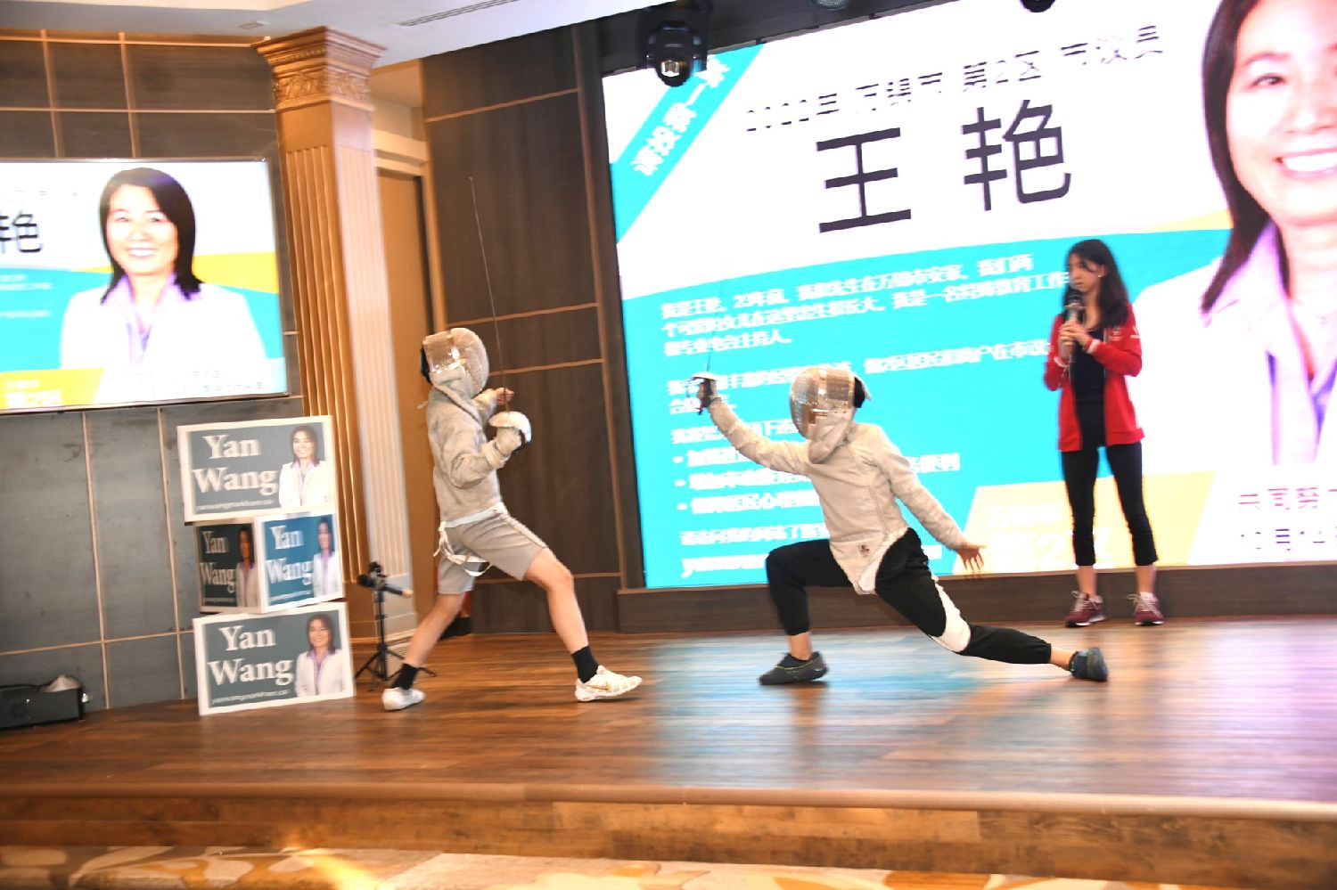 在热烈的掌声中,议员侯选人Yan Wang王艳登台感谢来宾们的大力支持和自己竞选团队的刻苦努力。Yan用英语、粤语和普通话三种语言激情阐述了自己的参政理念和竞选纲领。