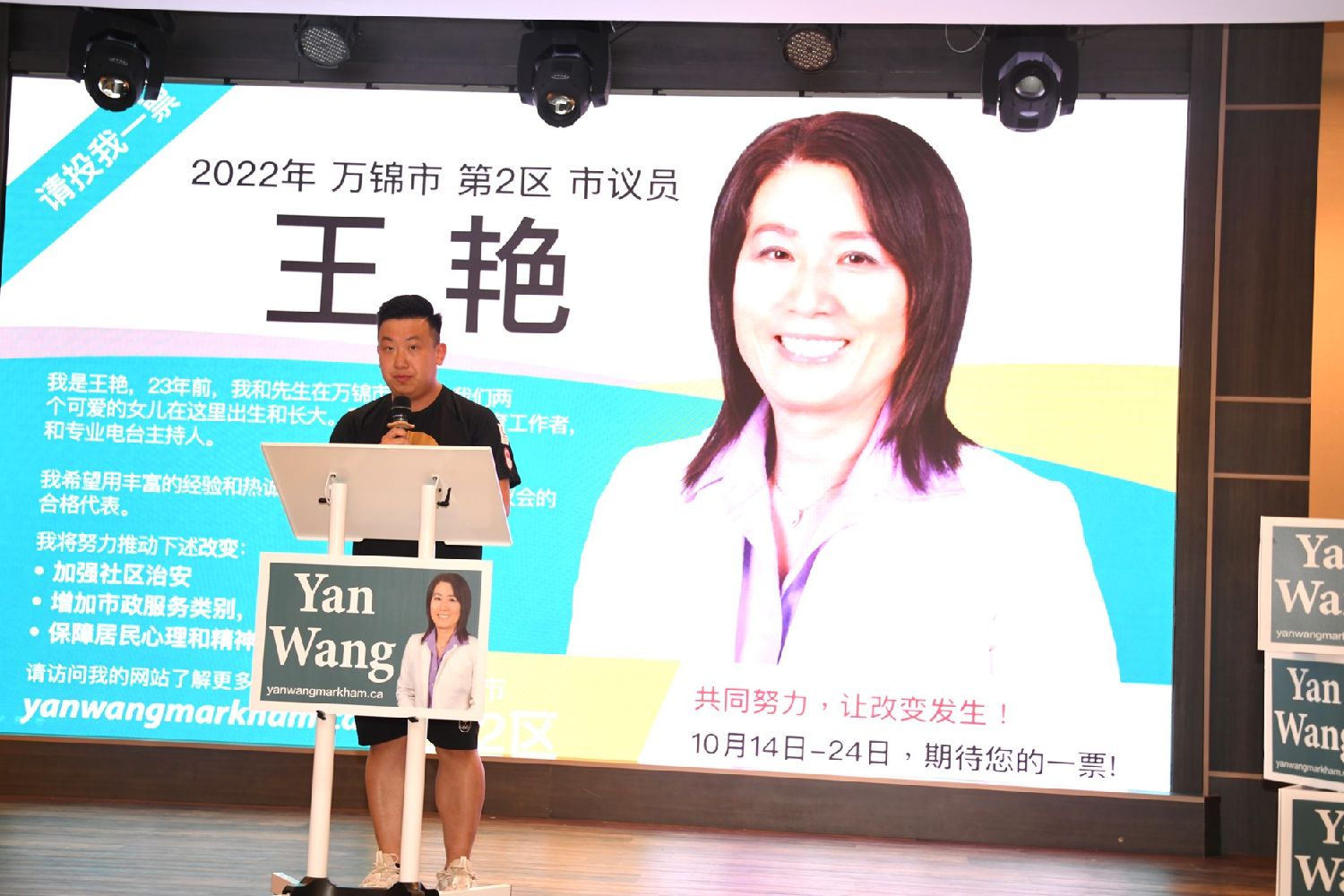 Yan承诺当选后,她将大力推动万锦市政府对青少年成长的支持,为他们在教育、社会实践、身心健康、领导才能、公民意识培养等方面提供更多的服务,调动社会各界资源为青少年健康发展提供机会。以及她将推动市政服务对保障万锦市家庭和个人在精神健康方面的需求。