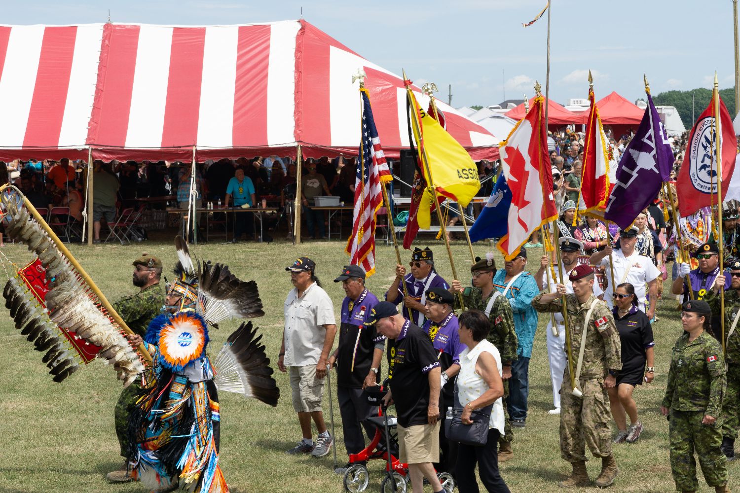 来自加拿大和美国的退役军人分别高举着加拿大国旗和印第安部落的旗帜迈着庄重的步伐带头走进表演会场,代表各个部落的舞者穿着他们设计的服装紧随其后并陆陆续续踏入场地并跟周围的观众打招呼。有人头顶一支白色大羽毛,有人穿着古典与现代相结合的印第安服饰,有人拖家带口穿着亲子装,其乐融融,太欢乐了!