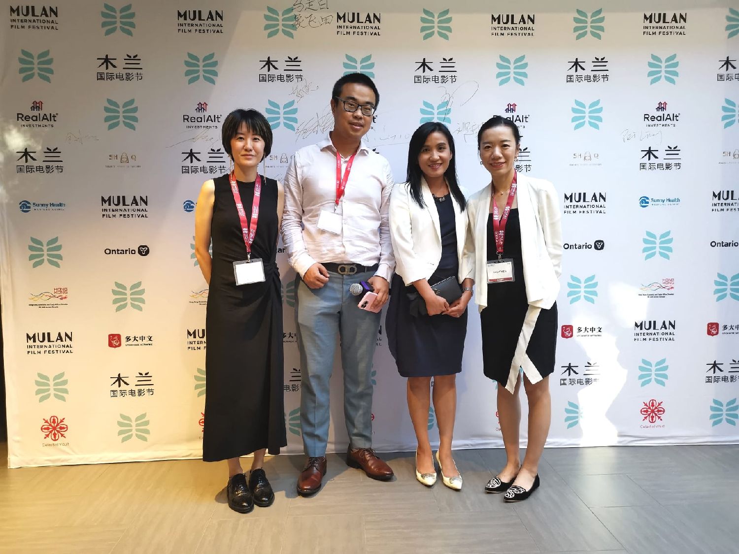 香港驻多伦多经济贸易办事处处长巫菀菁(右2)在《好好拍电影》放映前与木兰国际电影节共同创办人陈曦(右1)、艺术总监沈玮(左1)及执行总监王解难(左2)合照。