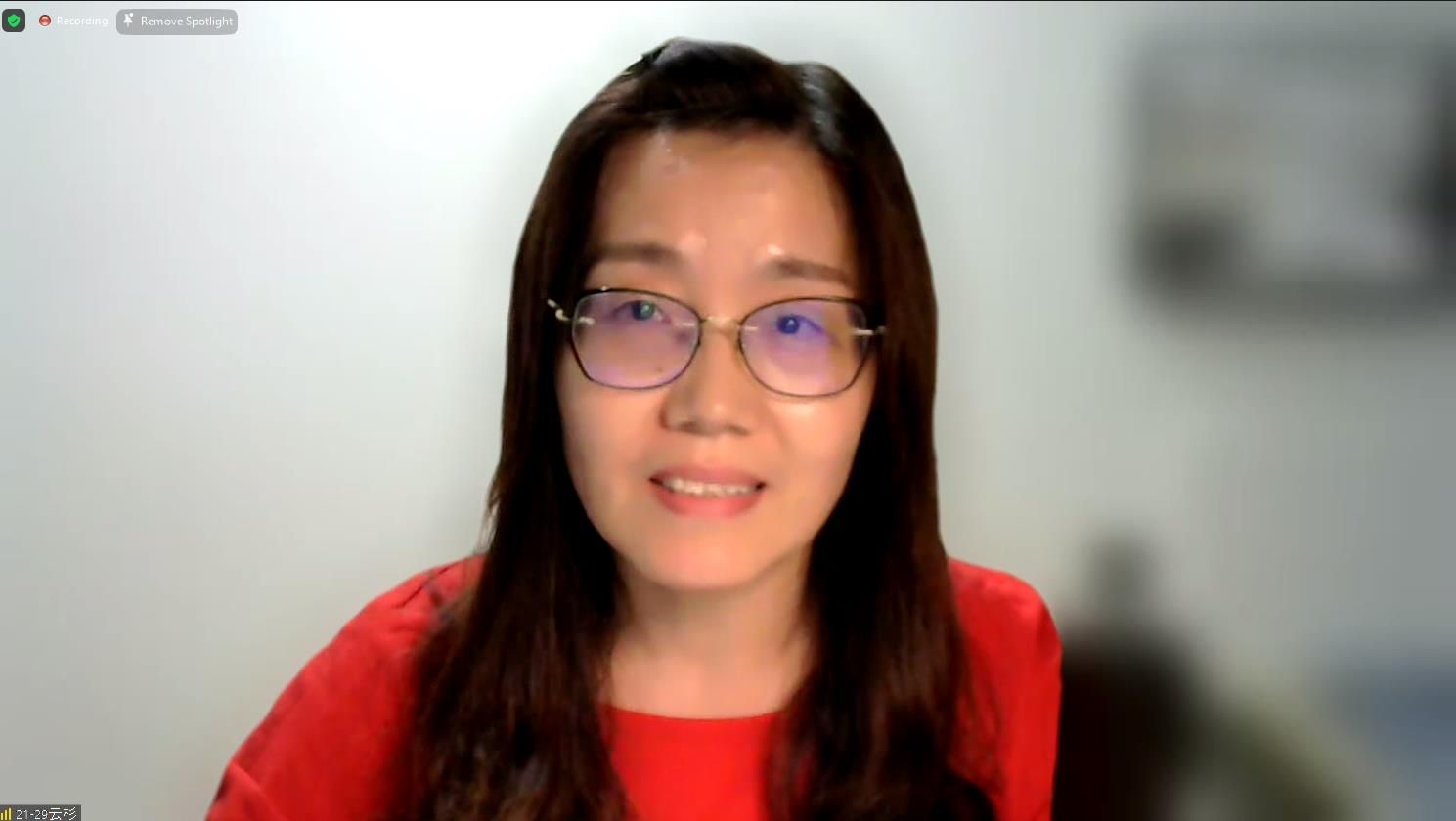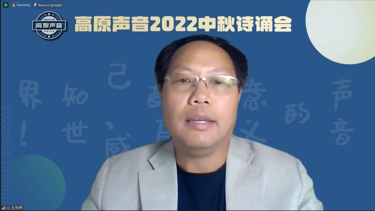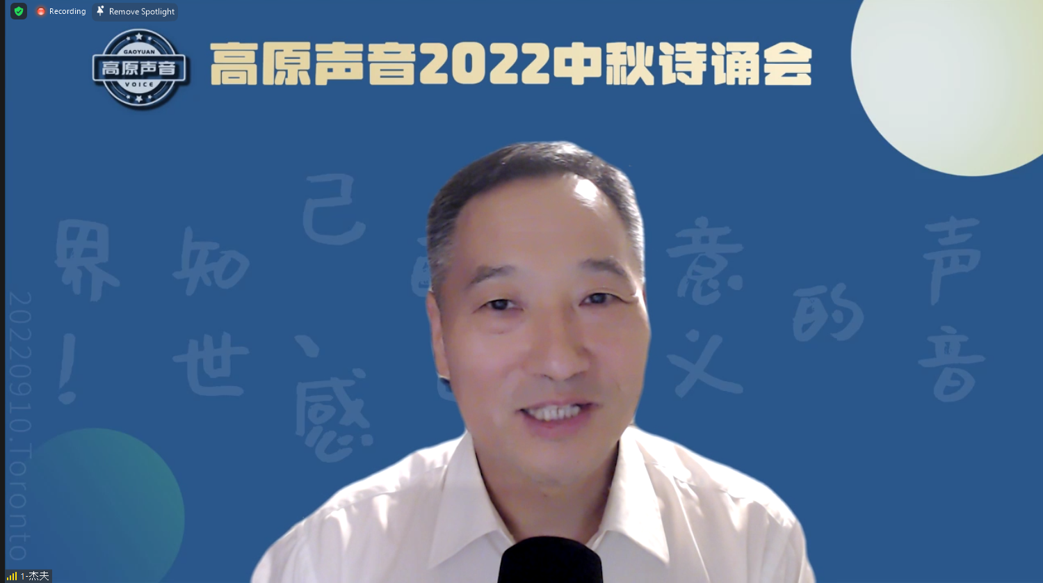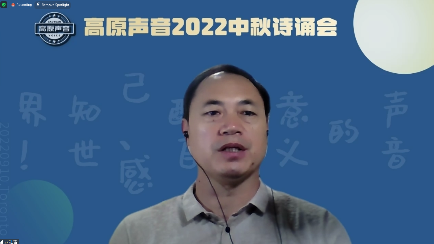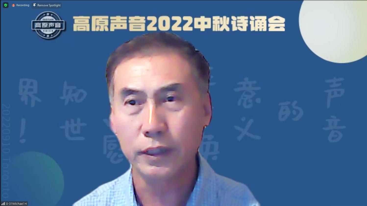 本次诗诵会总统筹Michael He在致辞中欢迎各位来宾欢聚云端,共度中秋佳节。他介绍说:参加中秋诗诵会朗诵的不仅有高原声音语言艺术中心的学员,还有不久前从这些学员中经过专业考核选拔出来的高原声音朗诵艺术院的朗诵员们。他们在播音朗诵艺术家、有声语言艺术教育家、科学发声与声音塑造权威专家、播音主持专业教授高原老师的精心教学和辅导下,经过系统的学习与训练,语言能力不断提高,创作水平逐步加强,可以驾驭不同体裁、不同风格、不同语言类型的有声语言作品。他衷心地感谢高原老师多年以来所做出的辛勤付出,感谢为高原声音做出奉献的朋友们,并特别感谢媒体的关注与支持。