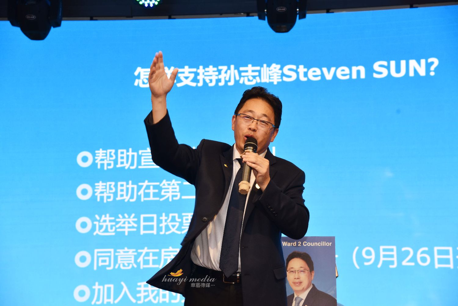市议员候选人孙志峰Steven Sun上台演讲更是别开生面。就象一个参加面试的应聘者,老老实实地介绍自己的专业教育背景、名企工作经历、成功创业经验,以及得过的奖项和为社会做出的工作。接下来,又自信满满地论证起自己这次“应聘”市议员一职成功之后能给二区的居民们带来什么改变。同时孙志峰还给500多名支持者上了一堂政治课,详细讲解了他为何参与选举,华人在加国的政治地位,如何进行投票等政治和选举知识。