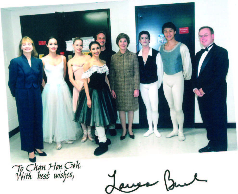 2005年,受邀苏珊·法瑞芭蕾舞团在美国巡演,与当时总统夫人Laura Bush(右4)合影灿
