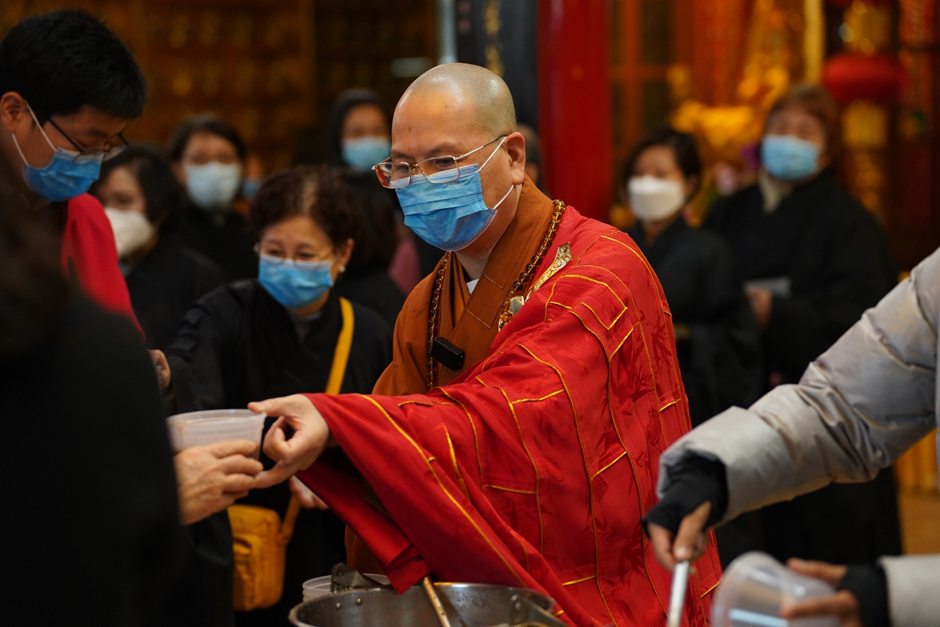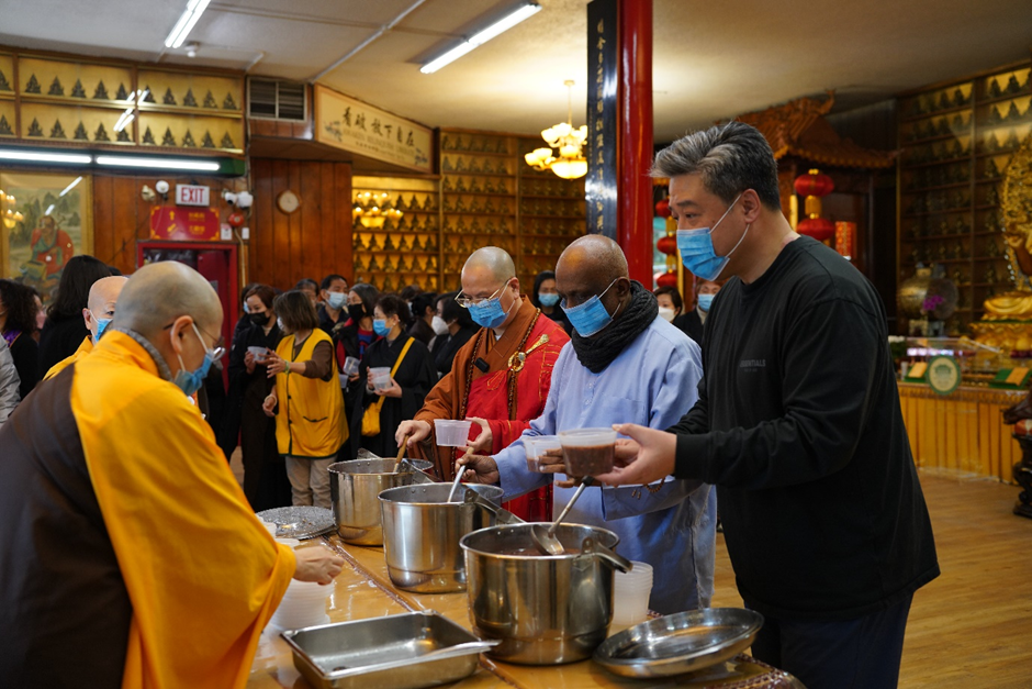 最后,达义大和尚和斯里兰卡大使以及董晗鹏议员等共同为大众送上热气腾腾的湛山腊八粥。湛山精舍内排队领取腊八粥的两序大众大排长龙,络绎不绝。