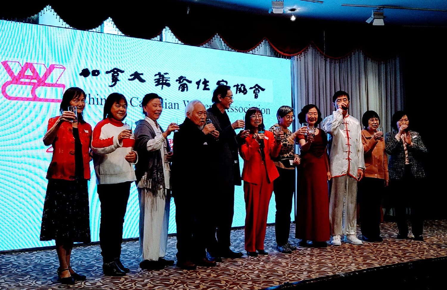 席间,加华作协全体理事在梁丽芳会长和陈浩泉执行会长的带领下,上台举杯向大家祝酒。