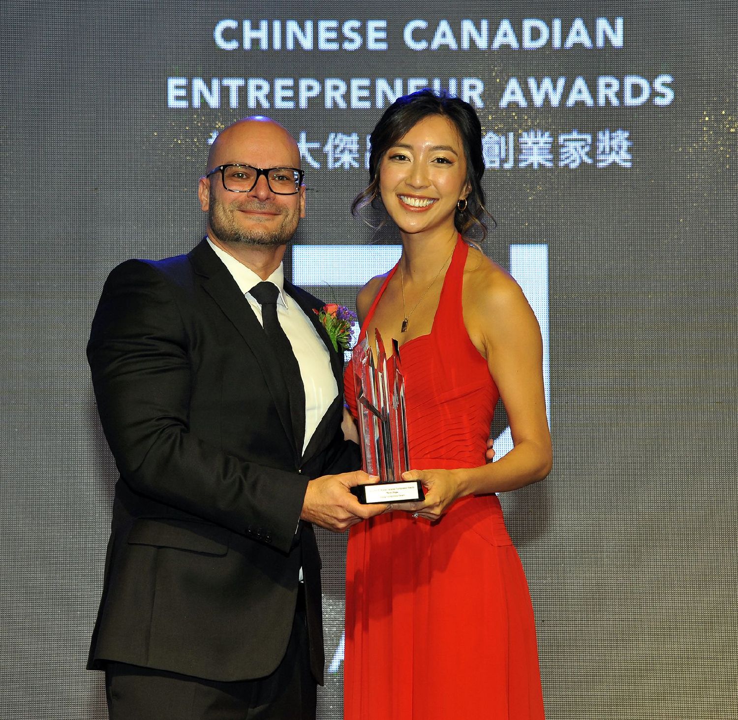 ↑ TD道明银行集团高级经理Daniel Liberman「最佳企业家奖」给林雨庆。