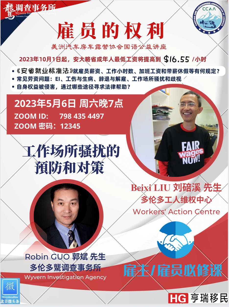 为了帮助华裔雇主和雇员了解各自的权利和义务,美洲汽车房车露营协会CCAA特邀大陆电气工程师出身的Workers’Action Centre干事、平权人士刘碚溪先生和多伦多驡调查事务所创始人郭斌先生做客公益讲堂。刘先生将从“雇员的权利”这个话题入手,为大家介绍《安省的就业标准法ESA》针对雇员薪资、工作小时数、加班工资和带薪休假等的规定。解答EI、工伤与生病、辞退与解雇、工作场所骚扰和歧视等劳资常见问题和介绍当自身权益被侵害,通过哪些途径寻求法律帮助。曾经主持过多起“工作场所骚扰”投诉案件调查的驡调查事务所郭先生将用实际案例生动地解析“工作场所骚扰”的界定和预防,以及劳资双方如何有效维权。