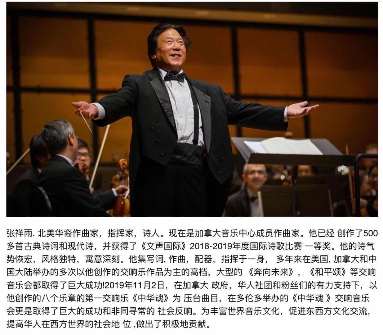 张祥雨,北美华裔作曲家,指挥家,诗人。现在是加拿大音乐中心成员作曲家。他已经创作了500多首古典诗词和现代诗,并获得了《文声国际》2018-2019年度国际诗歌比赛一等奖。他的诗气势恢宏,风格独特,寓意深刻。他集写词,作曲,配器,指挥于一身,多年来在美国,加拿大和中国大陆举办的多次以他创作的交响乐作品为主的高档,大型的《奔向未来》,《和平颂》等交响音乐会都取得了巨大成功!2019年11月2日,在加拿大政府,华人社团和粉丝们的有力支持下,以他创作的八个乐章的第一交响乐《中华魂》为压台曲目,在多伦多举办的《中华魂》交响音乐会更是取得了巨大的成功和非同寻常的社会反响。为丰富世界音乐文化,促进东西方文化交流提高华人在西方世界的社会地位做出了积极地贡献。