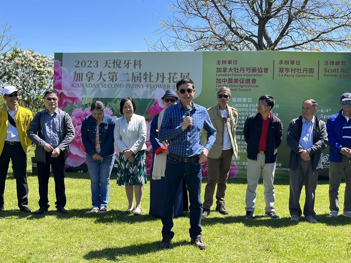 翠亨村牡丹园园长Nick Cai在致辞中表达了自己对牡丹的热爱,也分享了这些年种植牡丹的经验,最后还特别鸣谢冠名赞助天悦牙科、法律顾问Scott Au大律师、收银设备赞助MinPos收银系统、山东菏泽景玉牡丹种植有限公司、河南邵林牡丹园艺有限公司\加拿大牡丹芍药协会温哥华分会、加拿大华人园艺协会、暨南大学多伦多校友会、曹州百花园高级农艺师、中国牡丹芍药协会理事孙文海、中国国花园高级工程师邵安领、乙龙天、聚龙轩、龙珠自助餐厅、加中校友商业联盟、YouTube彬彬有院等等。