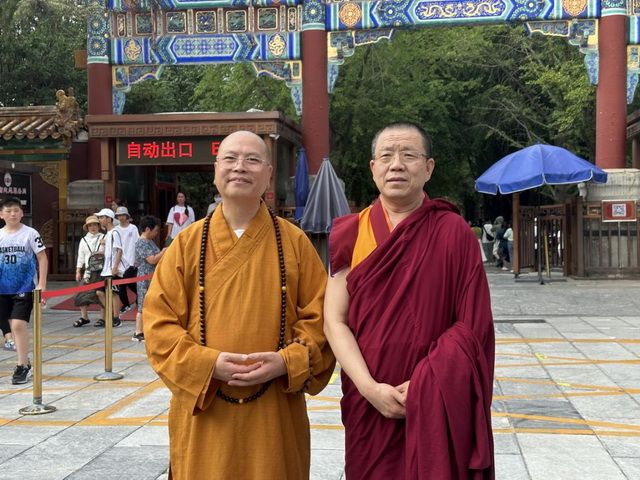 (左:加拿大佛教会会长达义大和尚,右:中国佛教协会副会长、北京市佛教协会会长、北京雍和宫住持胡雪峰喇嘛)