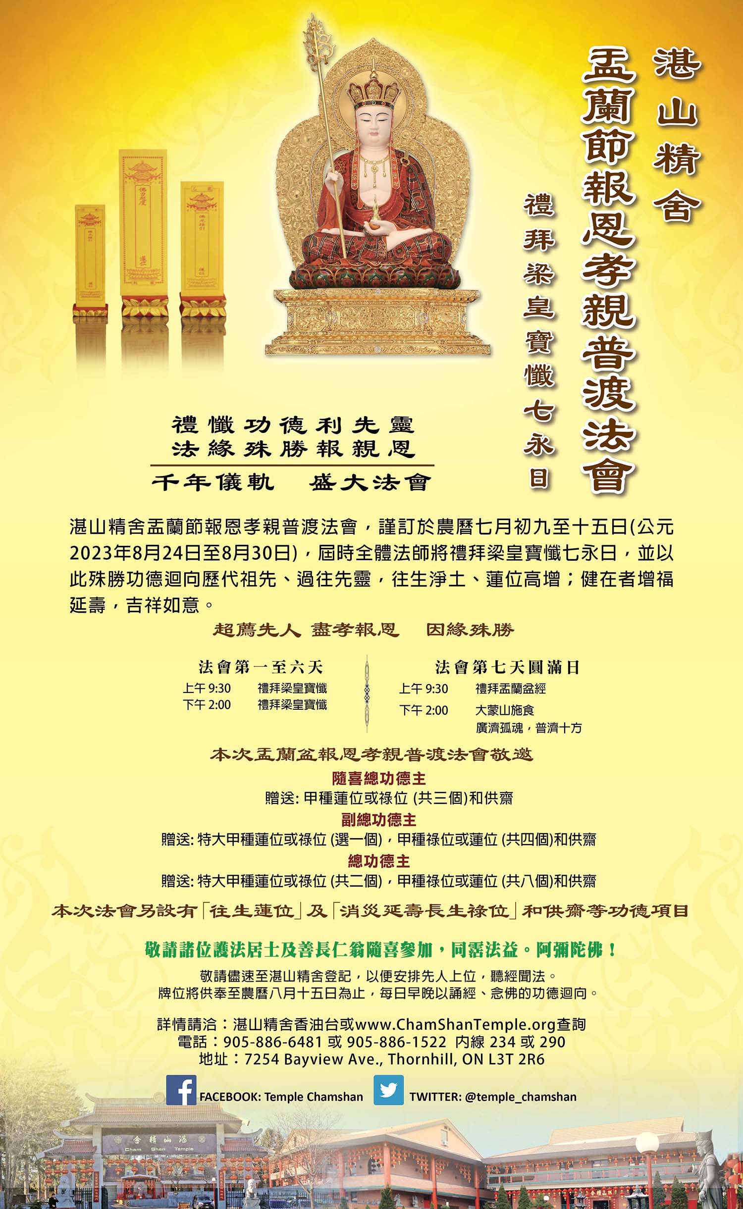 加拿大佛教会湛山精舍谨订于8月24日至30日(农历七月初九至十五日)在湛山精舍内启建盂兰盆报恩孝亲普渡法会,为期七天。