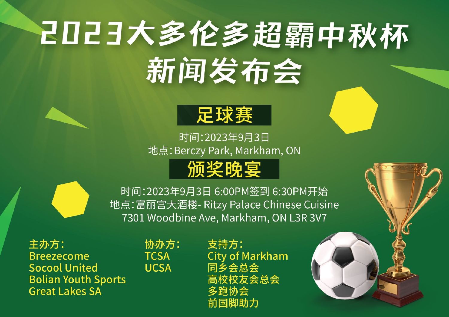 2023首届超霸中秋杯足球赛主办方8月27日举行新闻发布会宣布,球赛将于9月3日在万锦Berczy North公园举行;当晚在万錦「富丽宫酒楼」举行颁奖晚宴。赞助商和政要将为冠亚军颁发奖杯,及送出贺词。各界名人均会出席本次宴会,进一步扩大本次赛事的影响力!