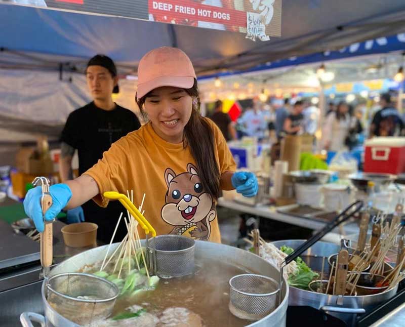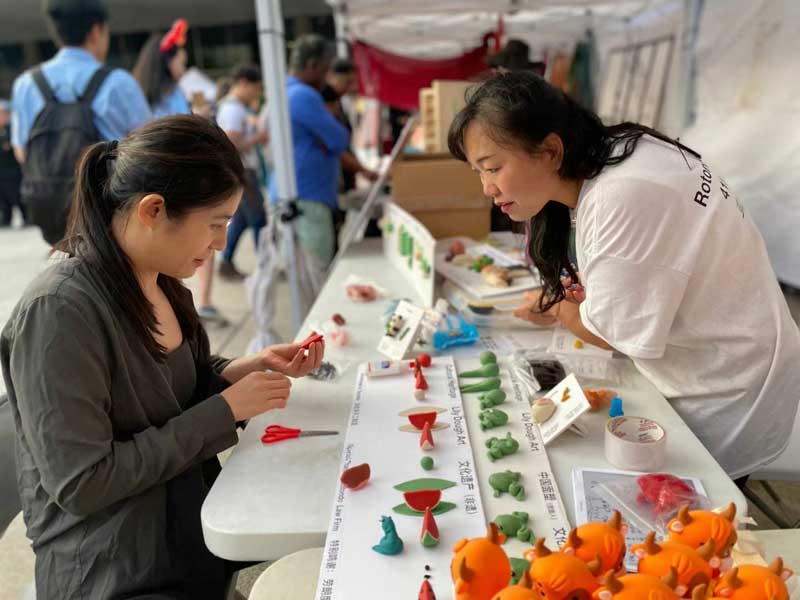 本届龙文化节除主舞台、水上秀台和广场表演之外,现场还有逾百个美食、小商品和文化摊位。记者在现场看到,书法达人石介正在一笔一划地为名为Nila的小女孩书写她的中文译名“妮拉”,当小女孩的父母准备酬谢掏出美元时,才知道他们一家是来自美国的游客。