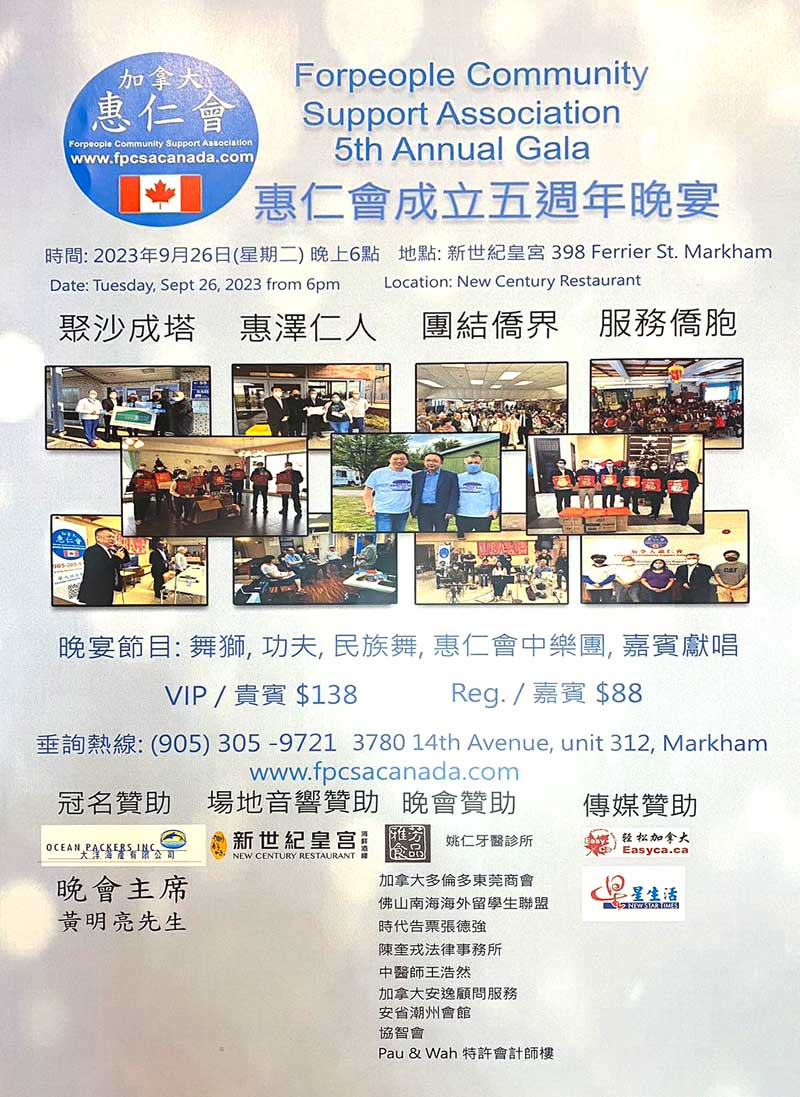 聚沙成塔,惠泽仁人。以团结侨界、服务侨胞为宗旨的华人社团加拿大惠仁会2023年迎来成立五周年。为纪念这一具有里程碑意义的历史时刻,惠仁会将于9月26日晚在新世纪皇宫大酒楼举行五周年庆晚宴。