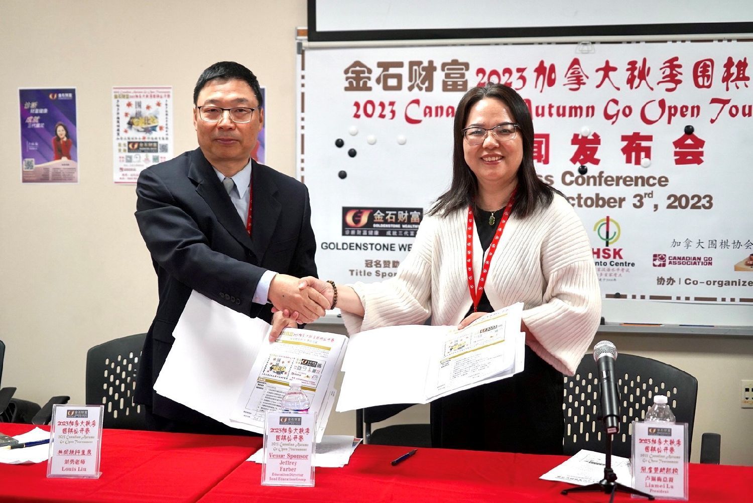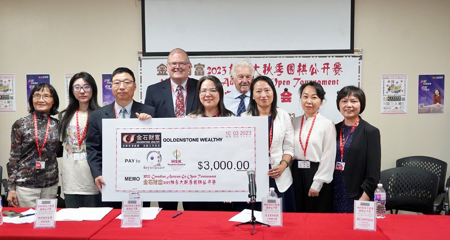 由多伦多弈趣围棋教室(Gofun Studio)和HSK多伦多汉语水平考试中心联袂主办的“2023加拿大秋季围棋公开赛”,获金石财富冠名赞助,于10月3日在场地赞助方邦德教育集团(Bond Education Group)所在地1500Birchmount Road,Toronto,Ontario举行举行新闻发布会,并与冠名赞助金石财富举行赞助签约及支票签发仪式。