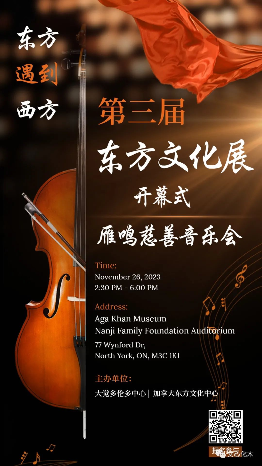 第三届东方文化艺术展将于11月26日下午2点30分,在阿迦汗博物馆国际音乐厅(Aga Khan Museum)隆重开幕。音乐会是由加拿大东方文化中心主办,雁鸣画廊冠名赞助的。