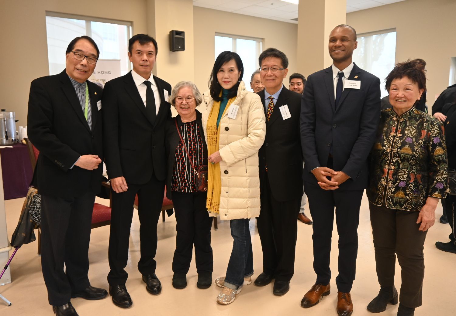 士嘉堡北市议员麦智谋(Jamaal Myers)、颐康创办人兼基金会主席王裕佳医生、颐康基金会总裁萧显扬与伍时畅慈善基金负责人伍颖梅女士(中)及伍氏家族成员Anthony Ng,以及颐康长者代表合影。