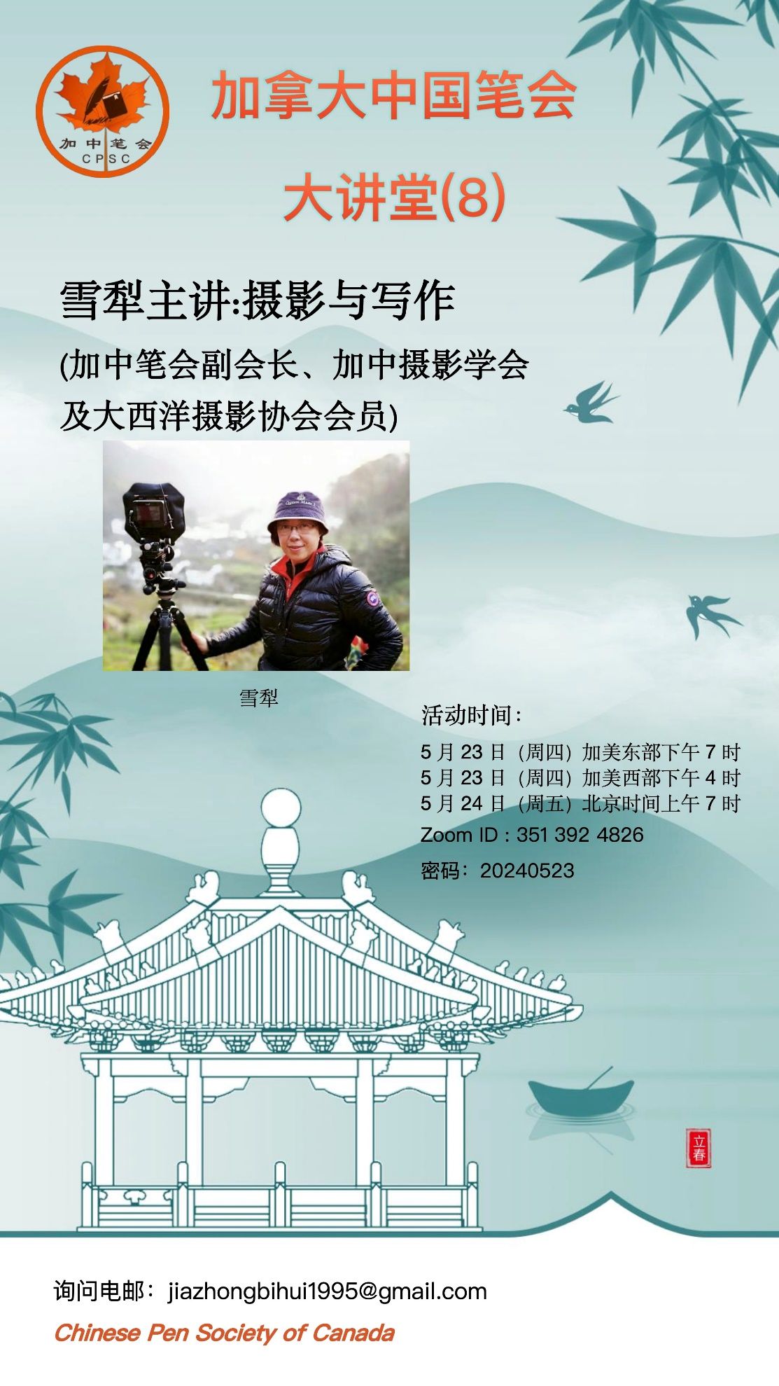 加中笔会5月23日又开坛,雪犁主讲摄影与写作