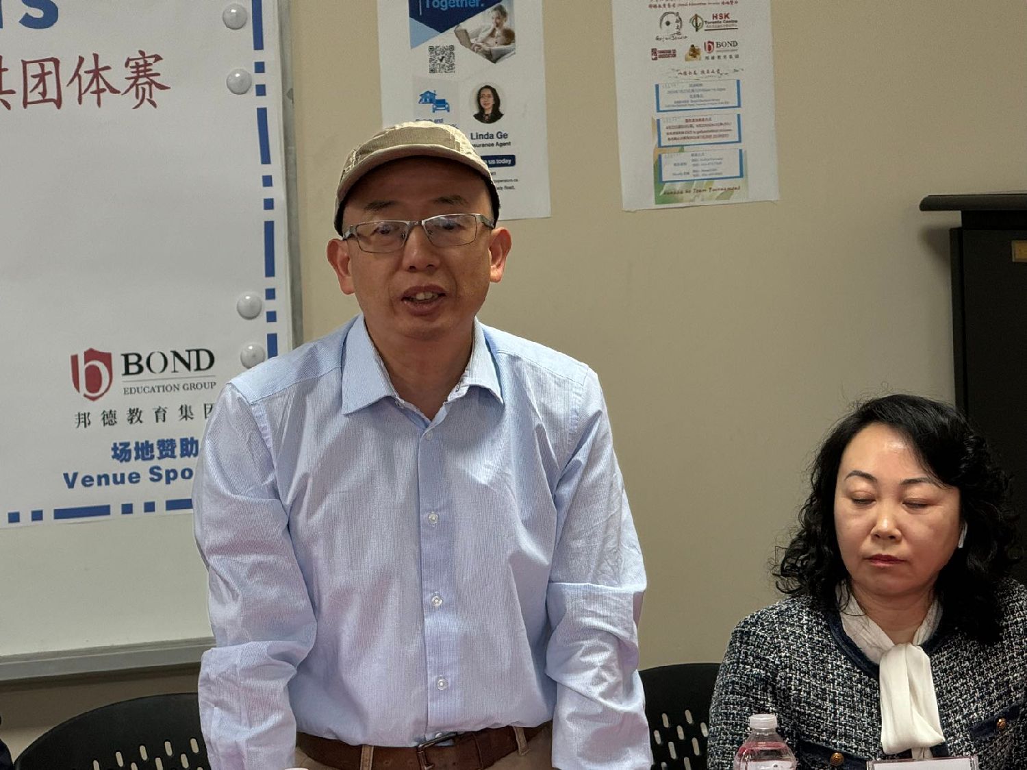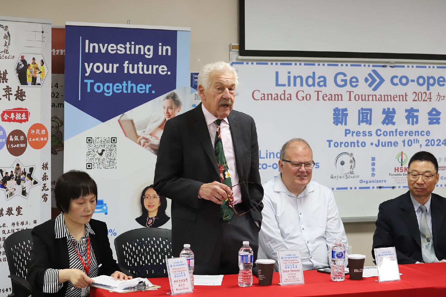 加拿大围棋协会(Canadian Go Association,CGA)主席James Sedwick应邀出席新闻发布会。他在致辞中表示,CGA成立于上世纪60年代初,其总体目标是与国际围棋社区和国际围棋赛事协调,尽可能在加拿大境内推广围棋,为围棋教学和青少年项目提供资助等一系列内容。James高度肯定了弈趣围棋成立以来在加拿大推广围棋运动所做的工作,并感谢HSK多伦多汉考中心与弈趣围棋主办该项赛事。
