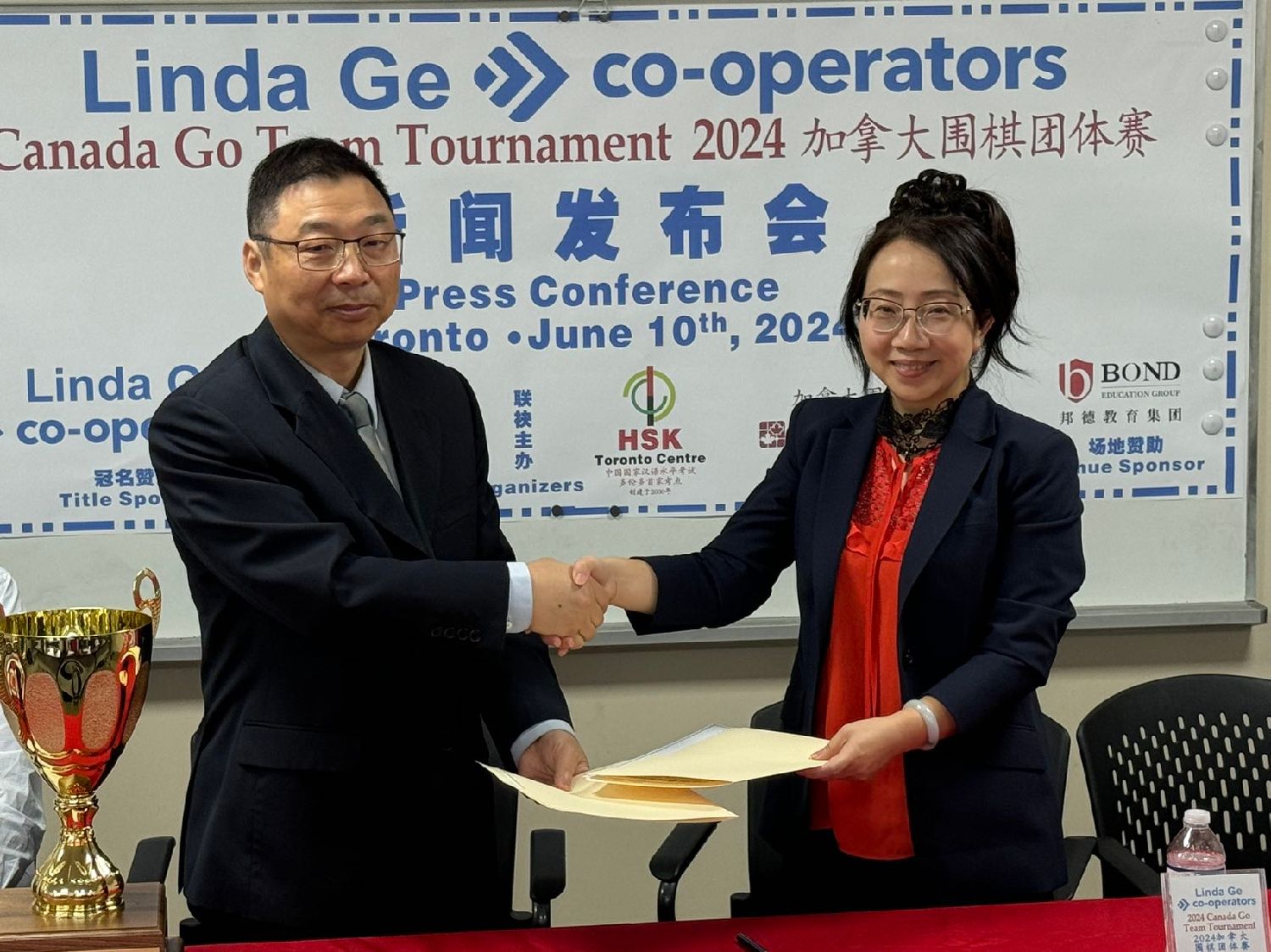 【冠名赞助Linda Ge Co-operators与2024加拿大围棋团体赛组委会共同主席刘勇在新闻发布会上签约并握手达成合作】