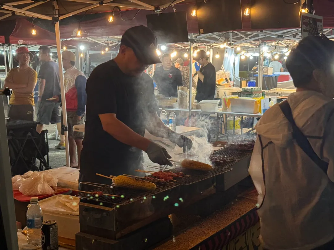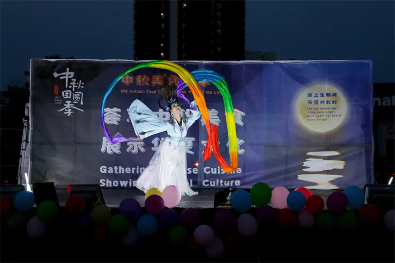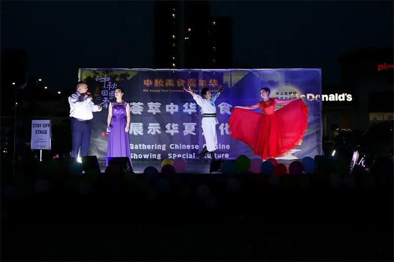 简短的开幕式后,精彩的文艺节目登场,一个又一个的节目在叫好声中进行着。广场上灯火辉煌,人声鼎沸,各式中秋美食摊位沿着广场排列整齐,空气中弥漫着诱人的香味。印度摊位的服饰也围满了游客,泰式按摩引来了很多人的观看。